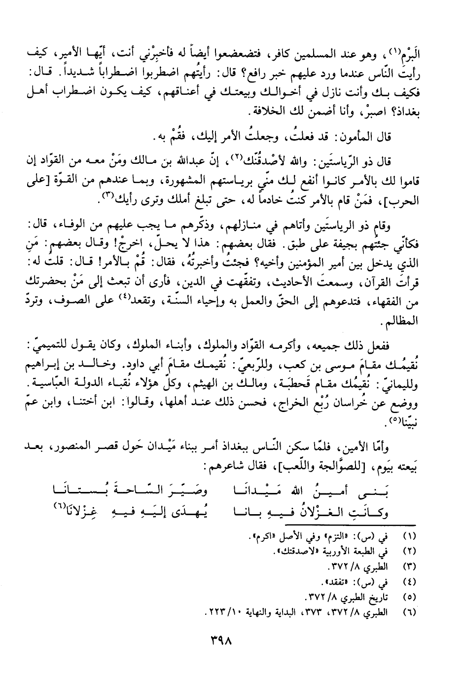 الْبَرْمِ، وَهُوَ عِنْدَ الْمُسْلِمِينَ كَافِرٌ، فَتَضَعْضَعُوا أَيْضًا لَهُ، فَأَخْبِرْنِي أَنْتَ، أَيُّهَا الْأَمِيرُ، كَيْفَ رَأَيْتَ النَّاسَ عِنْدَمَا وَرَدَ عَلَيْهِمْ خَبَرُ رَافِعٍ؟ قَالَ: رَأَيْتُهُمُ اضْطَرَبُوا اضْطِرَابًا شَدِيدًا. قَالَ: فَكَيْفَ بِكَ وَأَنْتَ نَازِلٌ فِي أَخْوَالِكَ وَبَيْعَتُكَ فِي أَعْنَاقِهِمْ، كَيْفَ يَكُونُ اضْطِرَابُ أَهْلِ بَغْدَاذَ؟ اصْبِرْ، وَأَنَا أَضْمَنُ لَكَ الْخِلَافَةَ.