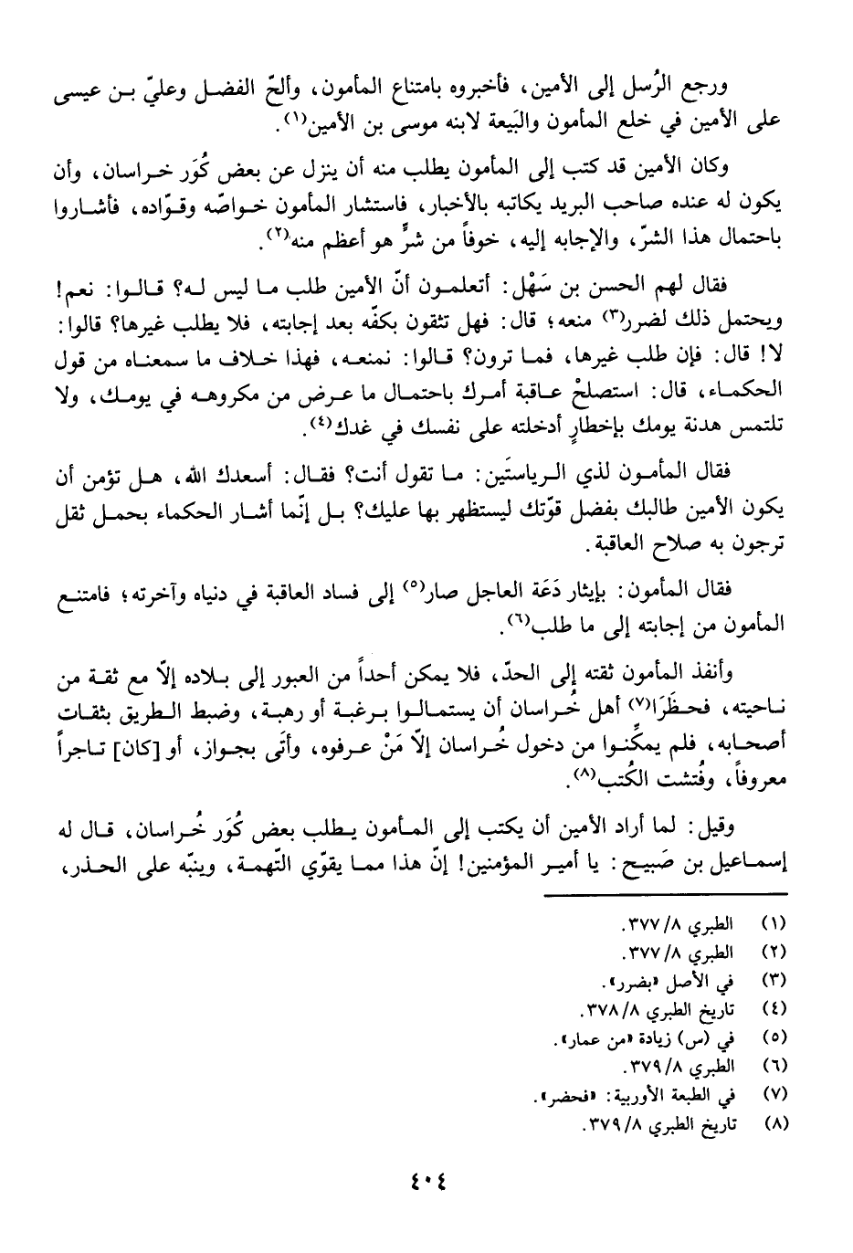 فَقَالَ لَهُمُ الْحَسَنُ بْنُ سَهْلٍ: أَتَعْلَمُونَ أَنَّ الْأَمِينَ طَلَبَ مَا لَيْسَ لَهُ؟ قَالُوا: نَعَمْ! وَيُحْتَمَلُ ذَلِكَ لِضَرَرِ مَنْعِهِ. قَالَ: فَهَلْ تَثِقُونَ بِكَفِّهِ بَعْدَ إِجَابَتِهِ، فَلَا يَطْلُبُ غَيْرَهَا؟ قَالُوا: لَا! قَالَ: فَإِنْ طَلَبَ غَيْرَهَا، فَمَا تَرَوْنَ؟ قَالُوا: نَمْنَعُهُ، فَهَذَا خِلَافُ مَا سَمِعْنَاهُ مِنْ قَوْلِ الْحُكَمَاءِ. قَالَ: اسْتَصْلِحْ عَاقِبَةَ أَمْرِكَ بِاحْتِمَالِ مَا عَرَضَ مِنْ مَكْرُوهِهِ فِي يَوْمِكَ، وَلَا تَلْتَمِسْ هُدْنَةَ يَوْمِكَ بِإِخْطَارٍ أَدْخَلْتَهُ عَلَى نَفْسِكَ فِي غَدِكَ.