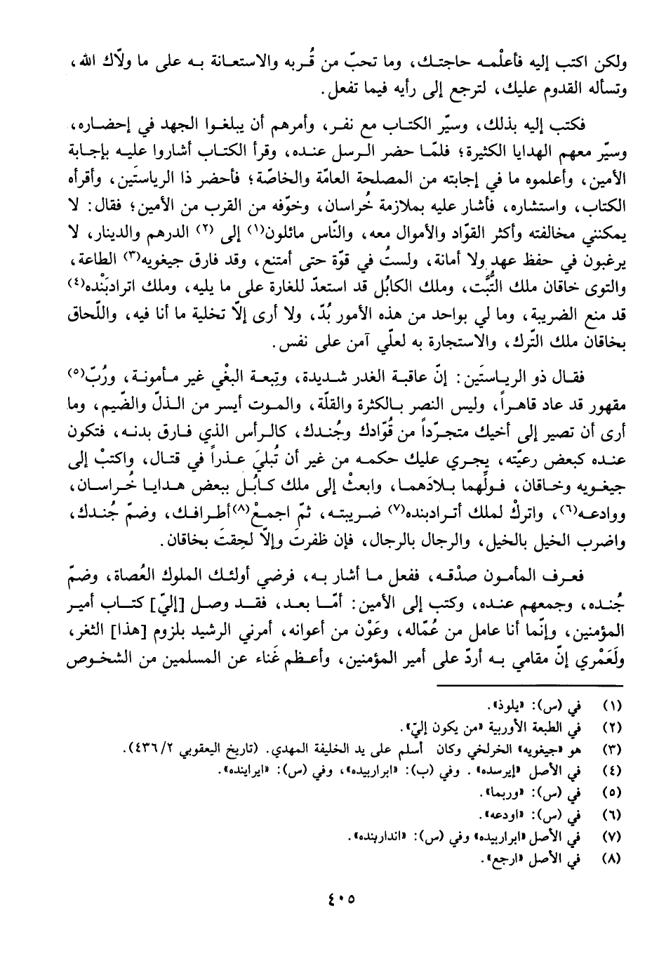 فَكَتَبَ إِلَيْهِ بِذَلِكَ، وَسَيَّرَ الْكِتَابَ مَعَ نَفَرٍ، وَأَمَرَهُمْ أَنْ يَبْلُغُوا الْجَهْدَ فِي إِحْضَارِهِ، وَسَيَّرَ مَعَهُمُ الْهَدَايَا الْكَثِيرَةَ، فَلَمَّا حَضَرَ الرُّسُلُ عِنْدَهُ، وَقَرَأَ الْكِتَابَ وَأَشَارُوا عَلَيْهِ بِإِجَابَةِ الْأَمِينِ، وَأَعْلَمُوهُ مَا فِي إِجَابَتِهِ مِنَ الْمَصْلَحَةِ الْعَامَّةِ وَالْخَاصَّةِ، فَأَحْضَرَ ذَا الرِّيَاسَتَيْنِ، وَأَقْرَأَهُ الْكِتَابَ وَاسْتَشَارَهُ، فَأَشَارَ عَلَيْهِ بِمُلَازَمَةِ خُرَاسَانَ، وَخَوَّفَهُ مِنَ الْقُرْبِ مِنَ الْأَمِينِ، فَقَالَ: لَا يُمْكِنُنِي مُخَالَفَتُهُ، وَأَكْثَرُ الْقُوَّادِ وَالْأَمْوَالِ مَعَهُ، وَالنَّاسُ مَائِلُونَ إِلَى الدِّرْهَمِ وَالدِّينَارِ، لَا يَرْغَبُونَ فِي حِفْظِ عَهْدٍ وَلَا أَمَانَةٍ، وَلَسْتُ فِي قُوَّةٍ حَتَّى أَمْتَنِعَ، وَقَدْ فَارَقَ جَيْغَوَيْهِ الطَّاعَةَ، وَالْتَوَى خَاقَانُ مَلِكُ التُّبَّتِ، وَمَلِكُ الْكَابُلِ قَدِ اسْتَعَدَّ لِلْغَارَةِ عَلَى مَا يَلِيهِ، وَمَلِكُ أَتْرَادِبَنْدَهْ قَدْ مَنَعَ الضَّرِيبَةَ، وَمَالِي بِوَاحِدٍ مِنْ هَذِهِ الْأُمُورِ بُدٌّ، وَلَا أَرَى إِلَّا تَخْلِيَةَ مَا أَنَا فِيهِ، وَاللِّحَاقَ بِخَاقَانَ مَلِكِ التُّرْكِ، وَالِاسْتِجَارَةَ بِهِ؛ لَعَلِّي آمَنُ عَلَى نَفْسِي.