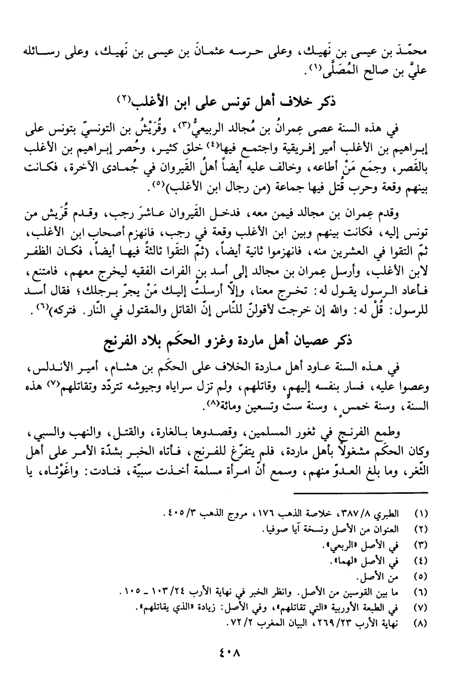 وَقَدِمَ عِمْرَانُ بْنُ مُجَالِدٍ فِيمَنْ مَعَهُ، فَدَخَلَ الْقَيْرَوَانَ عَاشِرَ رَجَبٍ، وَقَدِمَ قُرَيْشٌ مِنْ تُونِسَ إِلَيْهِ، فَكَانَتْ بَيْنَهُمْ وَبَيْنَ ابْنِ الْأَغْلَبِ وَقْعَةٌ فِي رَجَبٍ، فَانْهَزَمَ أَصْحَابُ ابْنِ الْأَغْلَبِ، ثُمَّ الْتَقَوْا فِي الْعِشْرِينَ مِنْهُ، فَانْهَزَمُوا ثَانِيَةً أَيْضًا، (ثُمَّ الْتَقَوْا ثَالِثَةً فِيهِ أَيْضًا، فَكَانَ الظَّفَرُ لِابْنِ الْأَغْلَبِ، وَأَرْسَلَ عِمْرَانُ بْنُ مُجَالِدٍ إِلَى أَسَدِ بْنِ الْفُرَاتِ الْفَقِيهِ لِيَخْرُجَ مَعَهُمْ، فَامْتَنَعَ، فَأَعَادَ الرَّسُولَ يَقُولُ لَهُ: تَخْرُجُ مَعَنَا، وَإِلَّا أَرْسَلْتُ إِلَيْكَ مَنْ يَجُرُّ بِرِجْلِكَ، فَقَالَ أَسَدٌ لِلرَّسُولِ: قُلْ لَهُ: وَاللَّهِ إِنْ خَرَجْتُ لَأَقُولَنَّ لِلنَّاسِ: إِنَّ الْقَاتِلَ وَالْمَقْتُولَ فِي النَّارِ. فَتَرَكَهُ) .