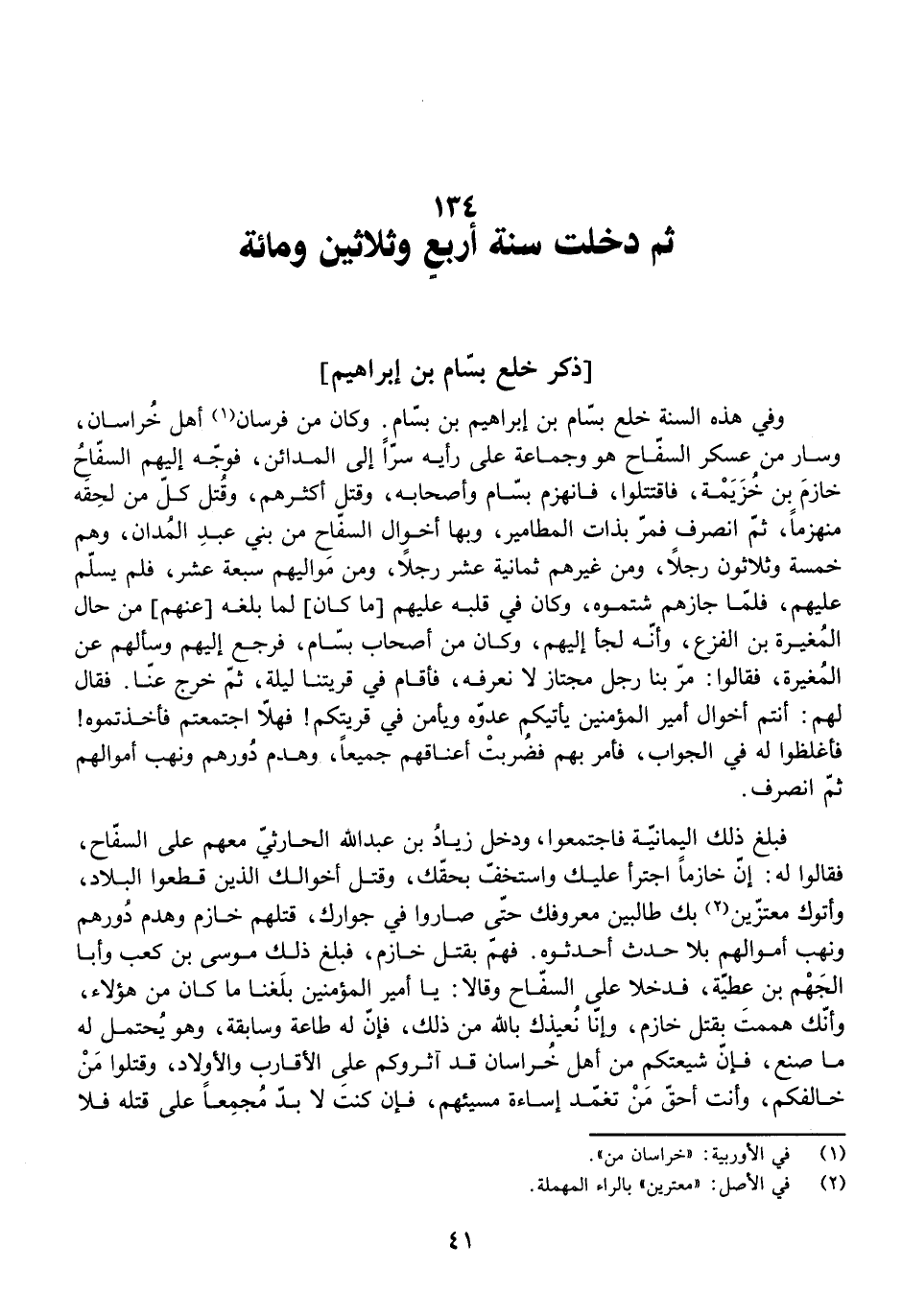 وَفِي هَذِهِ السَّنَةِ خَلَعَ بَسَّامُ بْنُ إِبْرَاهِيمَ بْنِ بَسَّامٍ، وَكَانَ مِنْ فُرْسَانِ أَهْلِ خُرَاسَانَ، وَسَارَ مِنْ عَسْكَرِ السَّفَّاحِ هُوَ وَجَمَاعَةٌ عَلَى رَأْيِهِ سِرًّا إِلَى الْمَدَائِنِ، فَوَجَّهَ إِلَيْهِ السَّفَّاحُ خَازِمَ بْنَ خُزَيْمَةَ، فَاقْتَتَلُوا، فَانْهَزَمَ بَسَّامٌ وَأَصْحَابُهُ، وَقُتِلَ أَكْثَرُهُمْ، وَقُتِلَ كُلُّ مَنْ لَحِقَهُ مُنْهَزِمًا.