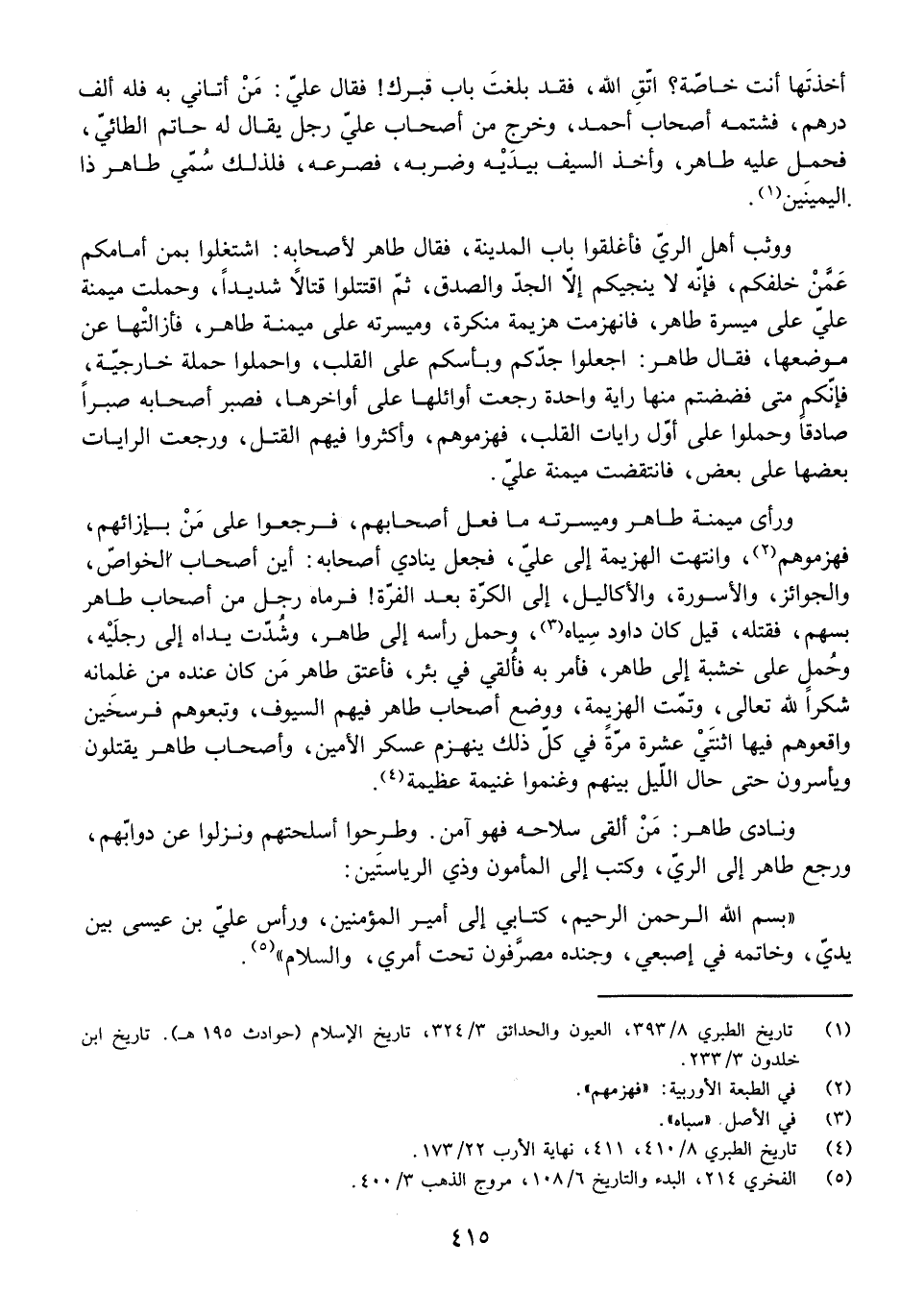 وَنَادَى طَاهِرٌ: مَنْ أَلْقَى سِلَاحَهُ فَهُوَ آمِنٌ. وَطَرَحُوا أَسْلِحَتَهُمْ وَنَزَلُوا عَنْ دَوَابِّهِمْ، وَرَجَعَ طَاهِرٌ إِلَى الرَّيِّ، وَكَتَبَ إِلَى الْمَأْمُونِ وَذِي الرِّيَاسَتَيْنِ: " بِسْمِ اللَّهِ الرَّحْمَنِ الرَّحِيمِ، كِتَابِي إِلَى أَمِيرِ الْمُؤْمِنِينَ، وَرَأْسُ عَلِيِّ بْنِ عِيسَى بَيْنَ يَدَيَّ، وَخَاتَمُهُ فِي إِصْبَعِي، وَجُنْدُهُ مُصَرَّفُونَ تَحْتَ أَمْرِي، وَالسَّلَامُ ".