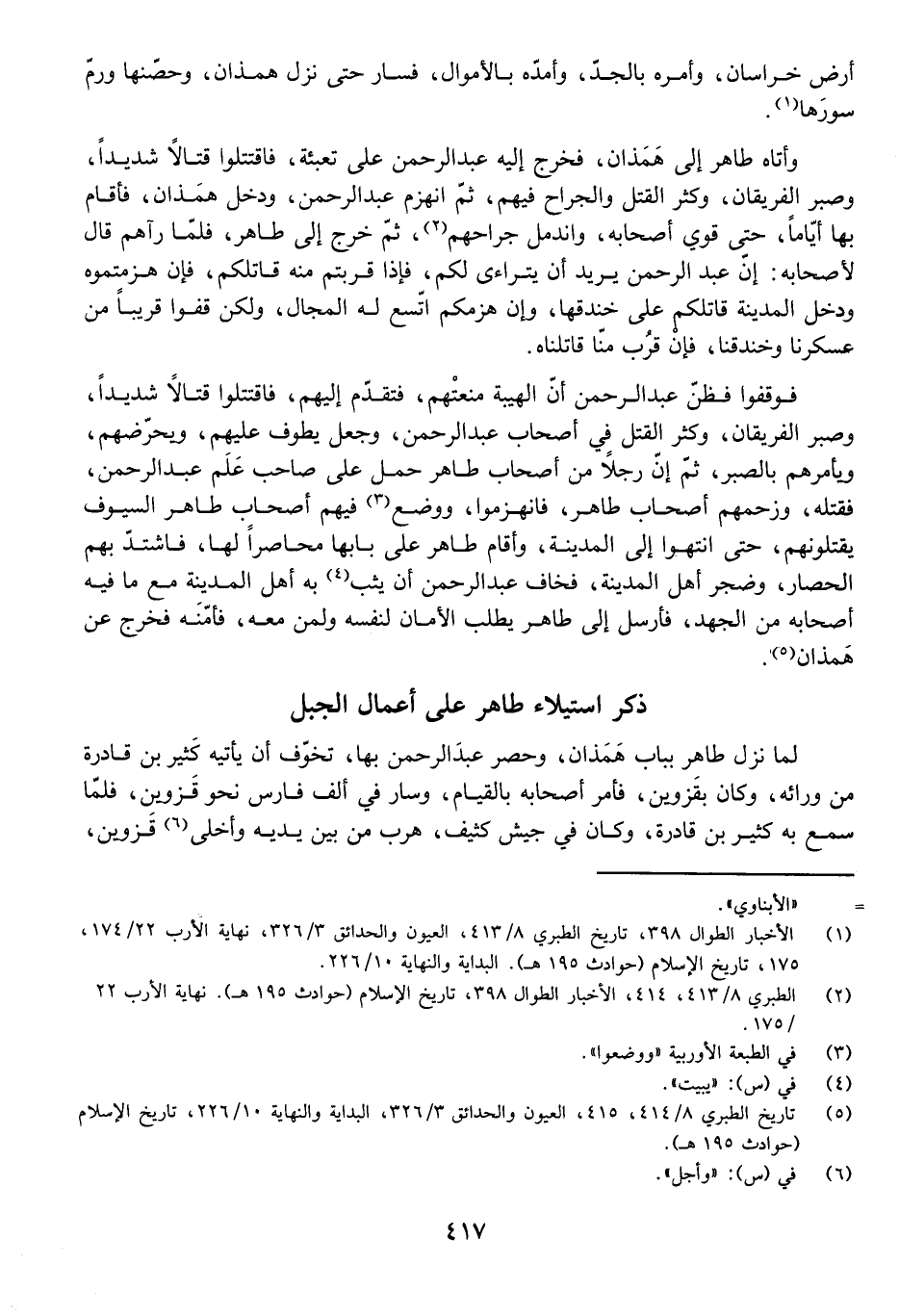 وَأَتَاهُ طَاهِرٌ إِلَى هَمَذَانَ، فَخَرَجَ إِلَيْهِ عَبْدُ الرَّحْمَنِ عَلَى تَعْبِئَةٍ، فَاقْتَتَلُوا قِتَالًا شَدِيدًا، وَصَبَرَ الْفَرِيقَانِ، وَكَثُرَ الْقَتْلُ وَالْجِرَاحُ فِيهِمْ، ثُمَّ انْهَزَمَ عَبْدُ الرَّحْمَنِ وَدَخَلَ هَمَذَانَ، فَأَقَامَ بِهَا أَيَّامًا، حَتَّى قَوِيَ أَصْحَابُهُ، وَانْدَمَلَ جِرَاحُهُمْ، ثُمَّ خَرَجَ إِلَى طَاهِرٍ، فَلَمَّا رَآهُمْ قَالَ لِأَصْحَابِهِ: إِنَّ عَبْدَ الرَّحْمَنِ يُرِيدُ أَنْ يَتَرَاءَى لَكُمْ، فَإِذَا قَرُبْتُمْ مِنْهُ قَاتَلَكُمْ، فَإِنْ هَزَمْتُمُوهُ وَدَخَلَ الْمَدِينَةَ قَاتَلَكُمْ عَلَى خَنْدَقِهَا، وَإِنْ هَزَمَكُمُ اتَّسَعَ لَهُ الْمَجَالُ، وَلَكِنْ قِفُوا قَرِيبًا مِنْ عَسْكَرِنَا وَخَنْدَقِنَا، فَإِنْ قَرُبَ مِنَّا قَاتَلْنَاهُ.