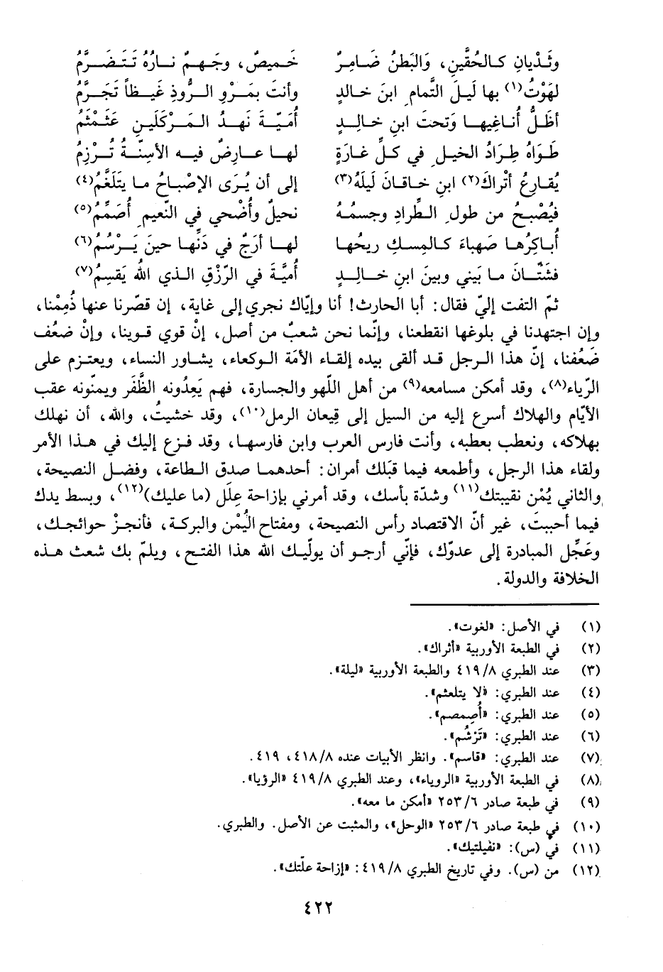 ثُمَّ الْتَفَتَ إِلَيَّ فَقَالَ: أَبَا الْحَرْثِ! أَنَا وَإِيَّاكَ نَجْرِي إِلَى غَايَةٍ، إِنْ قَصَّرْنَا عَنْهَا ذُمِمْنَا، وَإِنِ اجْتَهَدْنَا فِي بُلُوغِهَا انْقَطَعْنَا، وَإِنَّمَا نَحْنُ شِعْبٌ مِنْ أَصْلٍ، إِنْ قَوِيَ قَوِينَا، وَإِنْ ضَعُفَ ضَعُفْنَا، إِنَّ هَذَا الرَّجُلَ قَدْ أَلْقَى بِيَدِهِ إِلْقَاءَ الْأَمَةِ الْوَكْعَاءِ، يُشَاوِرُ النِّسَاءَ، وَيَعْتَزِمُ عَلَى الرِّيَاءِ، وَقَدْ أَمْكَنَ مَسَامِعَهُ مِنْ أَهْلِ اللَّهْوِ وَالْجَسَارَةِ، فَهُمْ يَعِدُونَهُ الظَّفَرَ، وَيُمَنُّونَهُ عَقِبَ الْأَيَّامِ، وَالْهَلَاكُ أَسْرَعُ إِلَيْهِ مِنَ السَّيْلِ إِلَى قِيعَانِ الرَّمْلِ، وَقَدْ خَشِيتُ وَاللَّهِ أَنْ نَهْلَكَ بِهَلَاكِهِ، وَنَعْطَبَ بِعَطَبِهِ، وَأَنْتَ فَارِسُ الْعَرَبِ وَابْنُ فَارِسِهَا، وَقَدْ فَزِعَ إِلَيْكَ فِي هَذَا الْأَمْرِ وَلِقَاءِ هَذَا الرَّجُلِ، وَأَطْمَعَهُ فِيمَا قِبَلِكَ أَمْرَانِ: أَحَدُهُمَا صِدْقُ الطَّاعَةِ وَفَضْلُ النَّصِيحَةِ، وَالثَّانِي يُمْنُ نَقِيبَتِكَ وَشَدَّةُ بَأْسِكَ، وَقَدْ أَمَرَنِي بِإِزَاحَةِ عِلَلِ (مَا عَلَيْكَ) ، وَبَسْطِ يَدِكَ فِيمَا أَحْبَبْتَ، غَيْرَ أَنَّ الِاقْتِصَادَ رَأْسُ النَّصِيحَةِ، وَمِفْتَاحُ الْيُمْنِ وَالْبَرَكَةِ، فَأَنْجِزْ حَوَائِجَكَ، وَعَجِّلِ الْمُبَادَرَةَ إِلَى عَدُوِّكَ، فَإِنِّي أَرْجُو أَنَّ يُوَلِّيَكَ اللَّهُ هَذَا الْفَتْحَ، وَيَلُمَّ بِكَ شَعْثَ هَذِهِ الْخِلَافَةِ وَالدَّوْلَةِ.