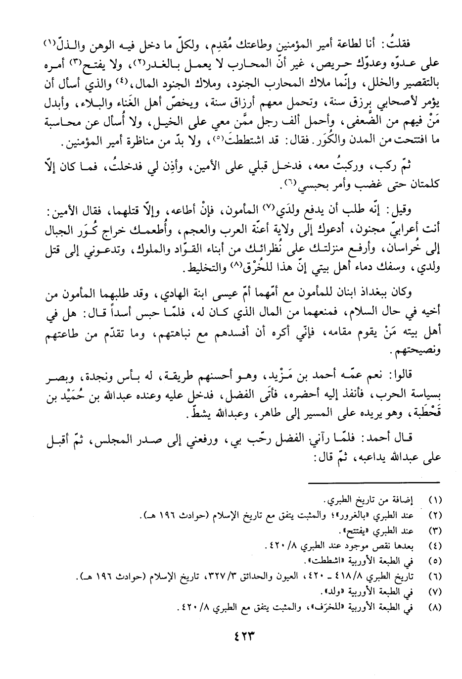 فَقُلْتُ: أَنَا لِطَاعَةِ أَمِيرِ الْمُؤْمِنِينَ وَطَاعَتِكَ مُقْدِمٌ، وَلِكُلِّ مَا دَخَلَ فِيهِ الْوَهْنُ عَلَى عَدُوِّهِ وَعَدُوِّكَ حَرِيصٌ، غَيْرَ أَنَّ الْمُحَارِبَ لَا يَعْمَلُ بِالْغَدْرِ، وَلَا يَفْتَحُ أَمْرَهُ بِالتَّقْصِيرِ وَالْخَلَلِ، وَإِنَّمَا مِلَاكُ الْمُحَارِبِ الْجُنُودُ، وَمِلَاكُ الْجُنُودِ الْمَالُ، وَالَّذِي أَسْأَلُ أَنْ يُؤْمَرَ لِأَصْحَابِي بِرِزْقِ سَنَةٍ، وَتُحْمَلَ مَعَهُمْ أَرْزَاقُ سَنَةٍ، وَيُخَصَّ أَهْلُ الْغَنَاءِ وَالْبِلَاءِ، وَأُبَدِّلَ مَنْ فِيهِمْ مِنَ الضَّعْفَى، وَأَحْمِلَ أَلْفَ رَجُلٍ مِمَّنْ مَعِي عَلَى الْخَيْلِ، وَلَا أُسْأَلَ عَنْ مُحَاسَبَةِ مَا افْتَتَحْتُ مِنَ الْمُدُنِ وَالْكُوَرِ. فَقَالَ: قَدِ اشْتَطَطْتَ، وَلَا بُدَّ مِنْ مُنَاظَرَةِ أَمِيرِ الْمُؤْمِنِينَ.