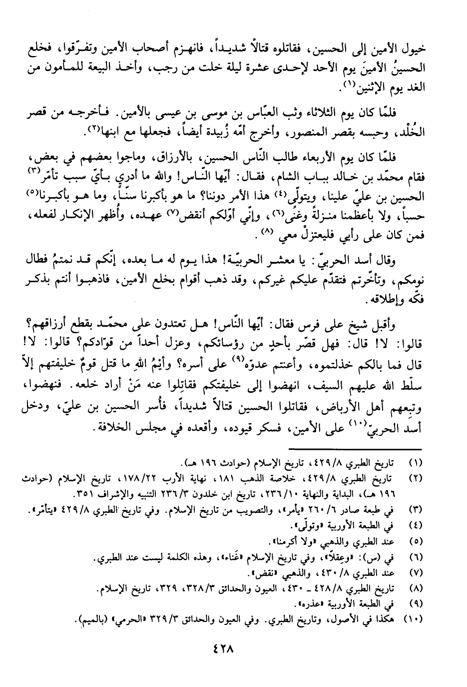 وَأَقْبَلَ شَيْخٌ عَلَى فَرَسٍ فَقَالَ: أَيُّهَا النَّاسُ، هَلْ تَعْتَدُونَ عَلَى مُحَمَّدٍ بِقَطْعِ أَرْزَاقِهِمْ؟ قَالُوا: لَا! قَالَ: فَهَلْ قَصَّرَ بِأَحَدٍ مِنْ رُؤَسَائِكُمْ، وَعَزَلَ أَحَدًا مِنْ قُوَّادِكُمْ؟ قَالُوا: لَا! قَالَ: فَمَا بَالُكُمْ خَذَلْتُمُوهُ، وَأَعَنْتُمْ عَدُوَّهُ عَلَى أَسْرِهِ؟ وَايْمُ اللَّهِ مَا قَتَلَ قَوْمٌ خَلِيفَتَهُمْ إِلَّا سَلَّطَ اللَّهُ عَلَيْهِمُ السَّيْفَ، انْهَضُوا إِلَى خَلِيفَتِكُمْ فَقَاتِلُوا عَنْهُ مَنْ أَرَادَ خَلْعَهُ. فَنَهَضُوا وَتَبِعَهُمْ أَهْلُ الْأَرْبَاضِ، فَقَاتَلُوا الْحُسَيْنَ قِتَالًا شَدِيدًا، فَأُسِرَ الْحُسَيْنُ بْنُ عَلِيٍّ، وَدَخَلَ أَسَدٌ الْحَرْبِيُّ عَلَى الْأَمِينِ، فَكَسَرَ قُيُودَهُ، وَأَقْعَدَهُ فِي مَجْلِسِ الْخِلَافَةِ.