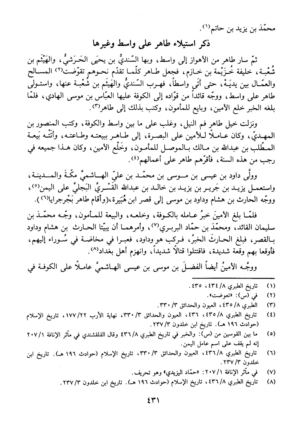 ثُمَّ سَارَ طَاهِرٌ مِنَ الْأَهْوَازِ إِلَى وَاسِطٍ، وَبِهَا السِّنْدِيُّ بْنُ يَحْيَى الْحَرَشِيُّ، وَالْهَيْثَمُ بْنُ شُعْبَةَ، خَلِيفَةُ خُزَيْمَةَ بْنِ خَازِمٍ، فَجَعَلَ طَاهِرٌ كُلَّمَا تَقَدَّمَ نَحْوَهُمْ تَقَوَّضَتِ الْمَسَالِحُ وَالْعُمَّالُ بَيْنَ يَدَيْهِ، حَتَّى أَتَى وَاسِطًا، فَهَرَبَ السِّنْدِيُّ وَالْهَيْثَمُ بْنُ شُعْبَةَ عَنْهَا، وَاسْتَوْلَى طَاهِرٌ عَلَى وَاسِطٍ، وَوَجَّهَ قَائِدًا مِنْ قُوَّادِهِ إِلَى الْكُوفَةِ عَلَيْهَا الْعَبَّاسُ بْنُ مُوسَى الْهَادِي، فَلَمَّا بَلَغَهُ الْخَبَرُ خَلَعَ الْأَمِينَ، وَبَايَعَ لِلْمَأْمُونِ، وَكَتَبَ بِذَلِكَ إِلَى طَاهِرٍ.