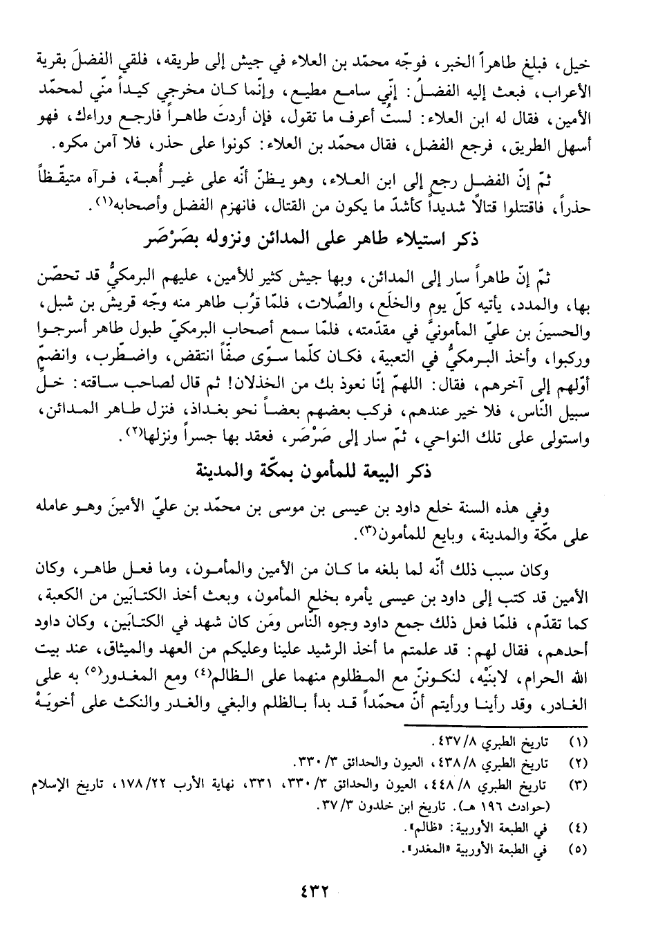 خَيْلٍ، فَبَلَغَ طَاهِرًا الْخَبَرُ، فَوَجَّهَ مُحَمَّدَ بْنَ الْعَلَاءِ فِي جَيْشٍ إِلَى طَرِيقِهِ، فَلَقِيَ الْفَضْلَ بِقَرْيَةِ الْأَعْرَابِ، فَبَعَثَ إِلَيْهِ الْفَضْلُ: إِنِّي سَامِعٌ مُطِيعٌ، وَإِنَّمَا كَانَ مَخْرَجِي كَيْدًا مِنِّي لِمُحَمَّدٍ الْأَمِينِ. فَقَالَ لَهُ ابْنُ الْعَلَاءِ: لَسْتُ أَعْرِفُ مَا تَقُولُ، فَإِنْ أَرَدْتَ طَاهِرًا فَارْجِعْ وَرَاءَكَ، فَهُوَ أَسْهَلُ الطَّرِيقِ. فَرَجَعَ الْفَضْلُ، فَقَالَ مُحَمَّدُ بْنُ الْعَلَاءِ: كُونُوا عَلَى حَذَرٍ، فَلَا آمَنُ مَكْرَهُ.