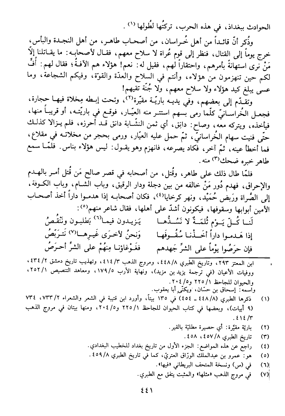 وَتَقَدَّمَ إِلَى بَعْضِهِمْ، وَفِي يَدَيْهِ بَارِيِّةٌ مُقَيَّرَةٌ، وَتَحْتَ إِبِطِهِ مِخْلَاةٌ فِيهَا حِجَارَةٌ، فَجَعَلَ الْخُرَاسَانِيُّ كُلَّمَا رَمَى بِسَهْمٍ اسْتَتَرَ مِنْهُ الْعَيَّارُ فَوَقَعَ فِي بَارِيَّتِهِ أَوْ قَرِيبًا مِنْهَا، فَيَأْخُذُهُ وَيَتْرُكُهُ مَعَهُ، وَصَاحَ: دَانِقٌ، أَيْ ثَمَنُ النُّشَّابَةِ دَانِقٌ قَدْ أَحْرَزَهُ، فَلَمْ يَزَالَا كَذَلِكَ حَتَّى فَنِيَتْ سِهَامُ الْخُرَاسَانِيِّ، ثُمَّ حَمَلَ عَلَيْهِ الْعَيَّارُ، وَرَمَى بِحَجَرٍ مِنْ مِخْلَاتِهِ فِي مِقْلَاعٍ، فَمَا أَخْطَأَ عَيْنَهُ، ثُمَّ آخَرَ، فَكَادَ يَصْرَعُهُ، فَانْهَزَمَ وَهُوَ يَقُولُ: لَيْسَ هَؤُلَاءِ بِنَاسٍ. فَلَمَّا سَمِعَ طَاهِرٌ خَبَرَهُ ضَحِكَ مِنْهُ.