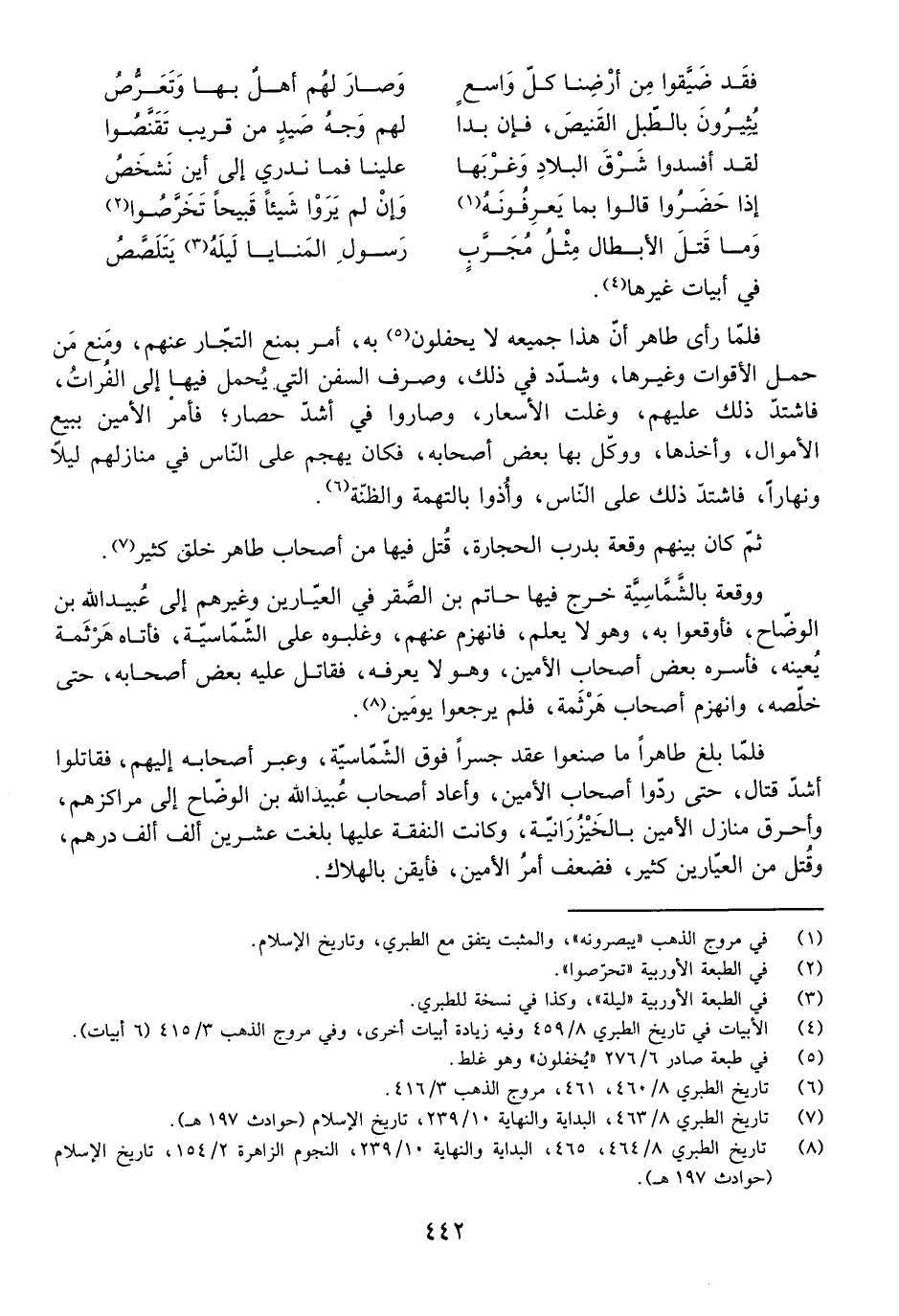 ثُمَّ كَانَ بَيْنَهُمْ وَقْعَةٌ بِدَرْبِ الْحِجَارَةِ، قُتِلَ فِيهَا مِنْ أَصْحَابِ طَاهِرٍ خَلْقٌ كَثِيرٌ. وَوَقْعَةٌ بِالشَّمَّاسِيَّةِ خَرَجَ فِيهَا حَاتِمُ بْنُ الصَّقْرِ فِي الْعَيَّارِينَ وَغَيْرِهِمْ إِلَى عُبَيْدِ اللَّهِ بْنِ الْوَضَّاحِ، فَأَوْقَعُوا بِهِ، وَهُوَ لَا يَعْلَمُ، فَانْهَزَمَ عَنْهُمْ، وَغَلَبُوهُ عَلَى الشَّمَّاسِيَّةِ، فَأَتَاهُ هَرْثَمَةُ يُعِينُهُ، فَأَسَرَهُ بَعْضُ أَصْحَابِ الْأَمِينِ وَهُوَ لَا يَعْرِفُهُ، فَقَاتَلَ عَلَيْهِ بَعْضَ أَصْحَابِهِ حَتَّى خَلَّصَهُ، وَانْهَزَمَ أَصْحَابُ هَرْثَمَةَ فَلَمْ يَرْجِعُوا يَوْمَيْنِ.