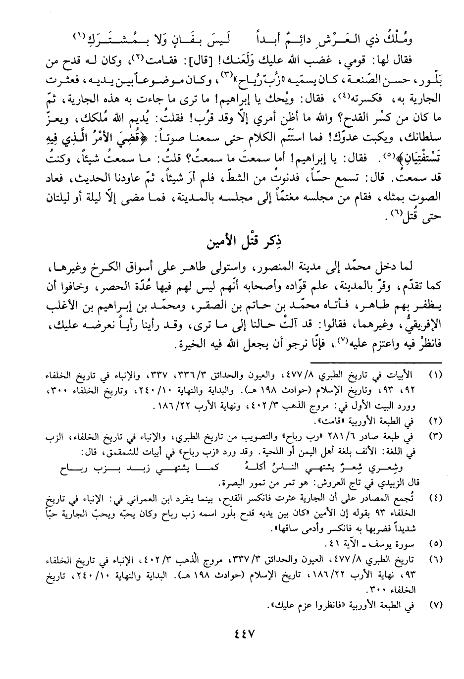 فَقَالَ لَهَا: قُومِي، غَضِبَ اللَّهُ عَلَيْكِ وَلَعَنَكِ! [قَالَ] : فَقَامَتْ، وَكَانَ لَهُ قَدَحٌ مِنْ بَلُّورٍ، حَسَنُ الصَّنْعَةِ، كَانَ يُسَمِّيهِ " زَبَّ رُيَاحَ "، وَكَانَ مَوْضُوعًا بَيْنَ يَدَيْهِ، فَعَثَرَتِ الْجَارِيَةُ بِهِ فَكَسَرَتْهُ، فَقَالَ: وَيْحَكَ يَا إِبْرَاهِيمُ! مَا تَرَى مَا جَاءَتْ بِهِ هَذِهِ الْجَارِيَةُ، ثُمَّ مَا كَانَ مِنْ كَسْرِ الْقَدَحِ؟ وَاللَّهِ مَا أَظُنُّ أَمْرِي إِلَّا وَقَدْ قَرُبَ! فَقُلْتُ: يُدِيمُ اللَّهُ مُلْكَكَ، وَيُعِزُّ سُلْطَانَكَ، وَيَكْبِتُ عَدُوَّكَ! فَمَا اسْتَتَمَّ الْكَلَامَ حَتَّى سَمِعْنَا صَوْتًا: {قُضِيَ الْأَمْرُ الَّذِي فِيهِ تَسْتَفْتِيَانِ} [يوسف: 41] . فَقَالَ: يَا إِبْرَاهِيمُ! أَمَا سَمِعْتَ مَا سَمِعْتُ؟ قُلْتُ: مَا سَمِعْتُ شَيْئًا - وَكُنْتُ قَدْ سَمِعْتُ -. قَالَ: تَسْمَعُ حِسًّا. فَدَنَوْتُ مِنَ الشَّطِّ، فَلَمْ أَرَ شَيْئًا، ثُمَّ عَاوَدْنَا الْحَدِيثَ، فَعَادَ الصَّوْتُ بِمِثْلِهِ، فَقَامَ مِنْ مَجْلِسِهِ مُغْتَمًّا إِلَى مَجْلِسِهِ بِالْمَدِينَةِ، فَمَا مَضَى إِلَّا لَيْلَةٌ أَوْ لَيْلَتَانِ حَتَّى قُتِلَ.