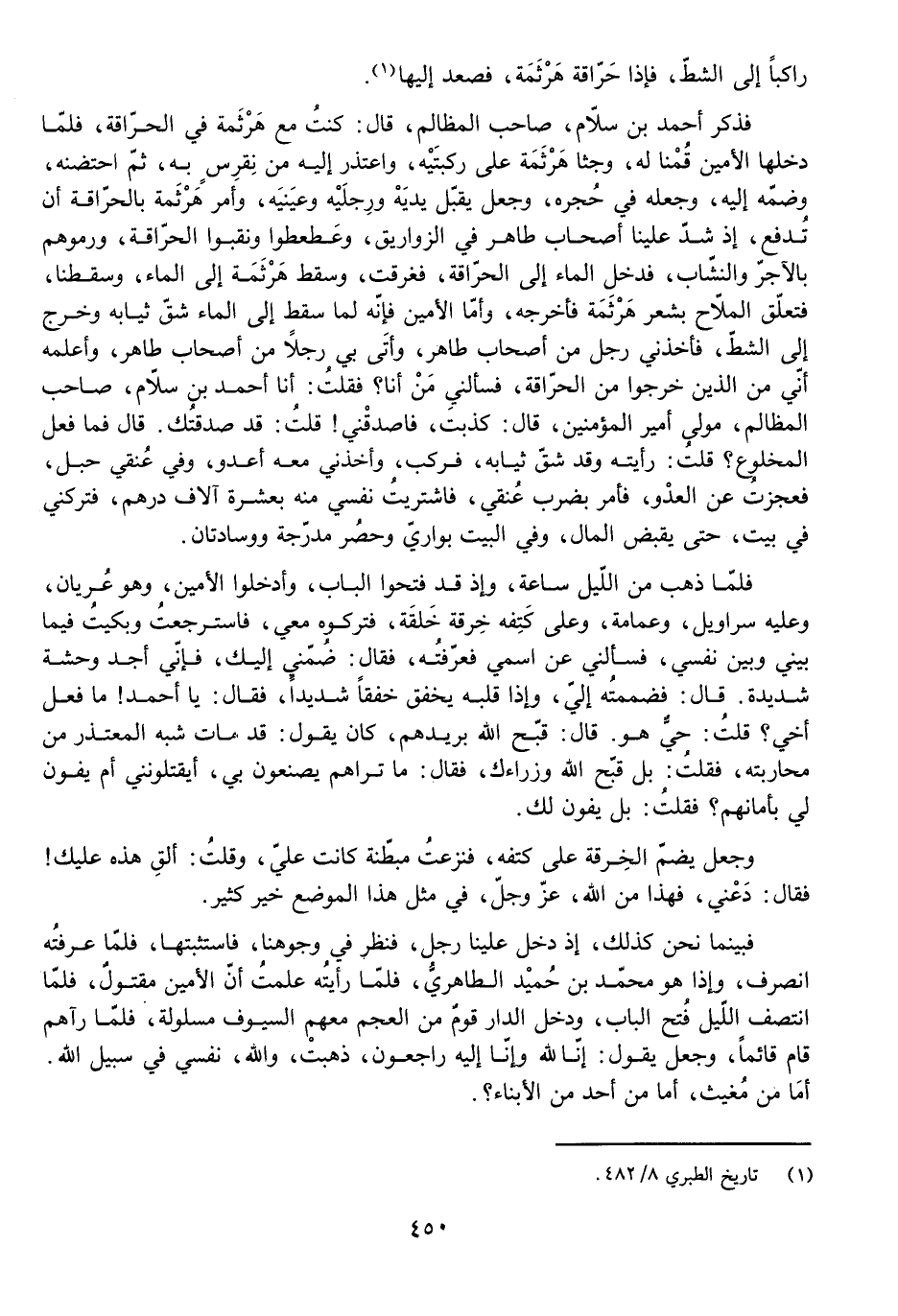 فَذَكَرَ أَحْمَدُ بْنُ سَلَّامٍ صَاحِبُ الْمَظَالِمِ، قَالَ: كُنْتُ مَعَ هَرْثَمَةَ فِي الْحَرَّاقَةِ، فَلَمَّا دَخَلَهَا الْأَمِينُ قُمْنَا لَهُ، وَجَثَا هَرْثَمَةُ عَلَى رُكْبَتَيْهِ، وَاعْتَذَرَ إِلَيْهِ مِنْ نِقْرِسٍ بِهِ، ثُمَّ احْتَضَنَهُ وَضَمَّهُ إِلَيْهِ، وَجَعَلَهُ فِي حِجْرِهِ، وَجَعَلَ يُقَبِّلُ يَدَيْهِ وَرِجْلَيْهِ وَعَيْنَيْهِ، وَأَمَرَ هَرْثَمَةُ بِالْحَرَّاقَةِ أَنْ تُدْفَعَ، إِذْ شَدَّ عَلَيْنَا أَصْحَابُ طَاهِرٍ فِي الزَّوَارِيقِ، وَعَطْعَطُوا وَنَقَّبُوا الْحَرَّاقَةَ، وَرَمَوْهُمْ بِالْآجُرِّ وَالنُّشَّابِ، فَدَخَلَ الْمَاءُ إِلَى الْحَرَّاقَةِ، فَغَرِقَتْ، وَسَقَطَ هَرْثَمَةُ إِلَى الْمَاءِ وَسَقَطْنَا، فَتَعَلَّقَ الْمَلَّاحُ بِشَعْرِ هَرْثَمَةَ فَأَخْرَجَهُ، وَأَمَّا الْأَمِينُ فَإِنَّهُ لَمَّا سَقَطَ إِلَى الْمَاءِ شَقَّ ثِيَابَهُ وَخَرَجَ إِلَى الشَّطِّ، فَأَخَذَنِي رَجُلٌ مِنْ أَصْحَابِ طَاهِرٍ، وَأَتَى بِي رَجُلًا مِنْ أَصْحَابِ طَاهِرٍ، وَأَعْلَمَهُ أَنِّي مِنَ الَّذِينَ خَرَجُوا مِنَ الْحَرَّاقَةِ، فَسَأَلَنِي مَنْ أَنَا؟ فَقُلْتُ: أَنَا أَحْمَدُ بْنُ سَلَّامٍ، صَاحِبُ الْمَظَالِمِ، مَوْلَى أَمِيرِ الْمُؤْمِنِينَ، قَالَ: كَذَبْتَ، فَاصْدُقْنِي! قُلْتُ: قَدْ صَدَقْتُكَ. قَالَ: فَمَا فَعَلَ الْمَخْلُوعُ؟ قُلْتُ: رَأَيْتُهُ وَقَدْ شَقَّ ثِيَابَهُ. فَرَكِبَ، وَأَخَذَنِي مَعَهُ أَعْدُو وَفِي عُنُقِي حَبْلٌ، فَعَجَزْتُ عَنِ الْعَدْوِ، فَأَمَرَ بِضَرْبِ عُنُقِي، فَاشْتَرَيْتُ نَفْسِي مِنْهُ بِعَشَرَةِ آلَافِ دِرْهَمٍ، فَتَرَكَنِي فِي بَيْتٍ، حَتَّى يَقْبِضَ الْمَالَ، وَفِي الْبَيْتِ بَوَارِيُّ وَحُصُرٌ مُدَرَّجَةٌ وَوِسَادَتَانِ.