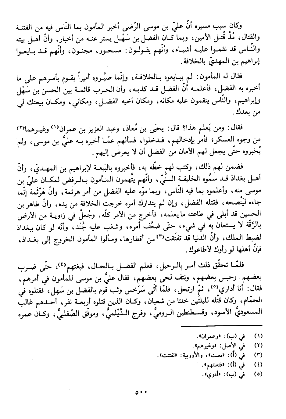 فَضَمِنَ لَهُمْ ذَلِكَ، وَكَتَبَ لَهُمْ خَطَّهُ بِهِ، فَأَخْبَرُوهُ بِالْبَيْعَةِ لِإِبْرَاهِيمَ بْنِ الْمَهْدِيِّ، وَأَنَّ أَهْلَ بَغْدَاذَ قَدْ سَمَّوْهُ الْخَلِيفَةَ السُّنِّيَّ، وَأَنَّهُمْ يَتَّهِمُونَ الْمَأْمُونَ بِالرَّفْضِ؛ لِمَكَانِ عَلِيِّ بْنِ مُوسَى مِنْهُ، وَأَعْلَمُوهُ بِمَا فِيهِ النَّاسُ، وَبِمَا مَوَّهَ عَلَيْهِ الْفَضْلُ مِنْ أَمْرِ هَرْثَمَةَ، وَأَنَّ هَرْثَمَةَ إِنَّمَا جَاءَهُ لِيَنْصَحَهُ، فَقَتَلَهُ الْفَضْلُ، وَإِنْ لَمْ يَتَدَارَكْ أَمْرَهُ خَرَجَتِ الْخِلَافَةُ مِنْ يَدِهِ، وَأَنَّ طَاهِرَ بْنَ الْحُسَيْنِ قَدْ أَبْلَى فِي طَاعَتِهِ مَا يَعْلَمُهُ، فَأُخْرِجَ مِنَ الْأَمْرِ كُلِّهِ، وَجُعِلَ فِي زَاوِيَةٍ مِنَ الْأَرْضِ بِالرَّقَّةِ، لَا يُسْتَعَانُ بِهِ فِي شَيْءٍ، حَتَّى ضَعُفَ أَمْرُهُ، وَشَغَبَ عَلَيْهِ جُنْدُهُ، وَأَنَّهُ لَوْ كَانَ بِبَغْدَاذَ لَضَبَطَ الْمُلْكَ، وَأَنَّ الدُّنْيَا قَدْ تَفَتَّقَتْ مِنْ أَقْطَارِهَا، وَسَأَلُوا الْمَأْمُونَ الْخُرُوجَ إِلَى بَغْدَاذَ، فَإِنَّ أَهْلَهَا لَوْ رَأَوْكَ لَأَطَاعُوكَ.