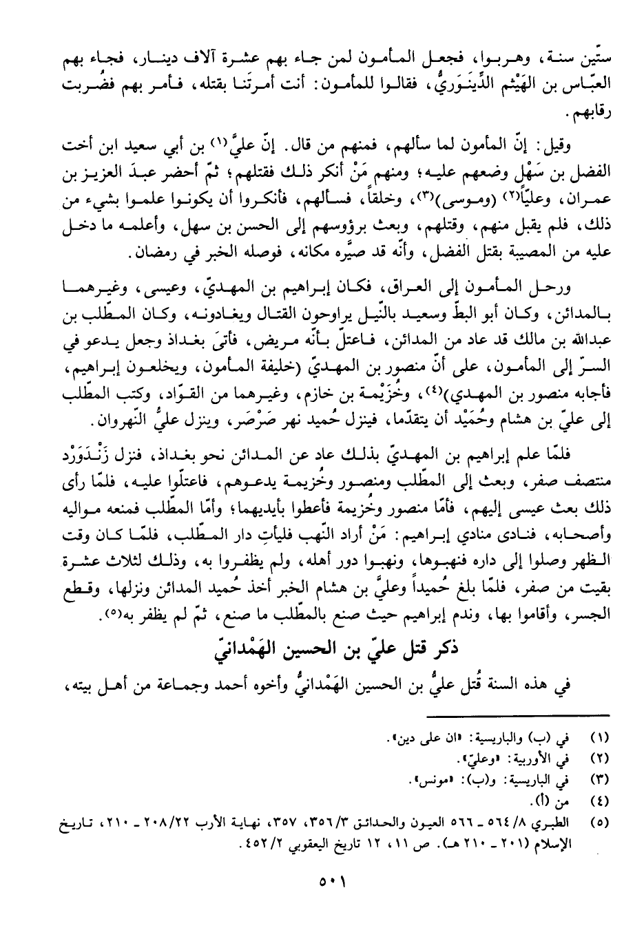 وَقِيلَ: إِنَّ الْمَأْمُونَ لَمَّا سَأَلَهُمْ، فَمِنْهُمْ مَنْ قَالَ: إِنَّ عَلِيَّ بْنَ أَبِي سَعِيدٍ ابْنَ أُخْتِ الْفَضْلِ بْنِ سَهْلٍ وَضَعَهُمْ عَلَيْهِ، وَمِنْهُمْ مَنْ أَنْكَرَ ذَلِكَ، فَقَتَلَهُمْ، ثُمَّ أَحْضَرَ عَبْدَ الْعَزِيزِ بْنَ عِمْرَانَ، وَعَلِيًّا (وَمُوسَى) ، وَخَلْقًا، فَسَأَلَهُمْ، فَأَنْكَرُوا أَنْ يَكُونُوا عَلِمُوا بِشَيْءٍ مِنْ ذَلِكَ، فَلَمْ يَقْبَلْ مِنْهُمْ، وَقَتَلَهُمْ، وَبَعَثَ بِرُءُوسِهِمْ إِلَى الْحَسَنِ بْنِ سَهْلٍ، وَأَعْلَمَهُ مَا دَخَلَ عَلَيْهِ مِنَ الْمُصِيبَةِ بِقَتْلِ الْفَضْلِ، وَأَنَّهُ قَدْ صَيَّرَهُ مَكَانَهُ، فَوَصَلَهُ الْخَبَرُ فِي رَمَضَانَ.