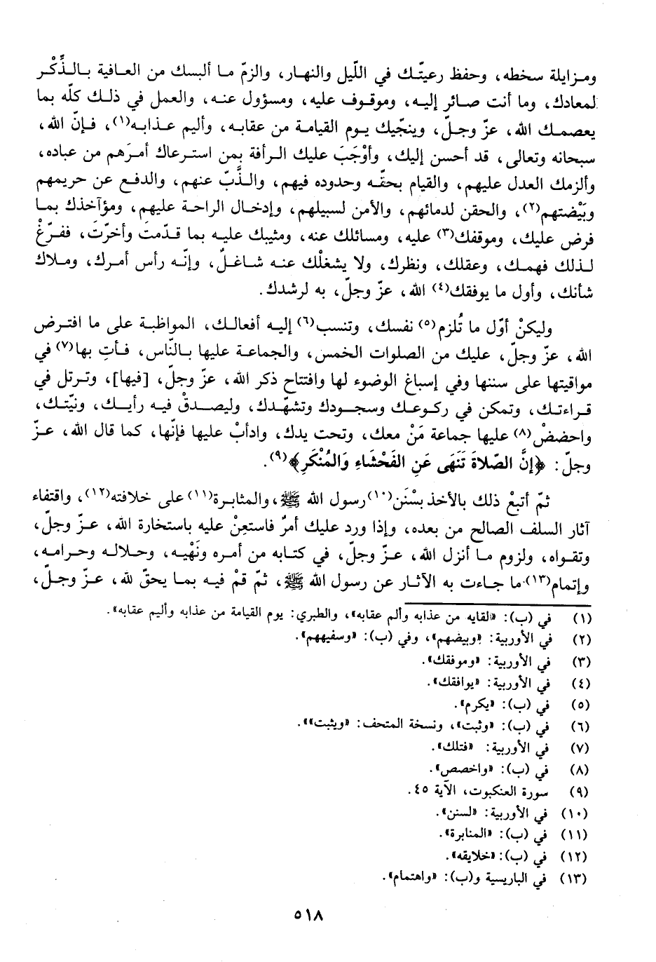 ثُمَّ أَتْبِعْ ذَلِكَ بِالْأَخْذِ بِسُنَنِ رَسُولِ اللَّهِ - صَلَّى اللَّهُ عَلَيْهِ وَسَلَّمَ - وَالْمُثَابَرَةِ عَلَى خِلَافَتِهِ، وَاقْتِفَاءِ آثَارِ السَّلَفِ الصَّالِحِ مِنْ بَعْدِهِ، وَإِذَا وَرَدَ عَلَيْكَ أَمْرٌ فَاسْتَعِنْ عَلَيْهِ بِاسْتِخَارَةِ اللَّهِ - عَزَّ وَجَلَّ - وَتَقْوَاهُ، وَلُزُومِ مَا أَنْزَلَ اللَّهُ - عَزَّ وَجَلَّ - فِي كِتَابِهِ مِنْ أَمْرِهِ وَنَهْيِهِ، وَحَلَالِهِ وَحَرَامِهِ، وَإِتْمَامِ مَا جَاءَتْ بِهِ الْآثَارُ عَنْ رَسُولِ اللَّهِ - صَلَّى اللَّهُ عَلَيْهِ وَسَلَّمَ - ثُمَّ قُمْ فِيهِ بِمَا يَحِقُّ لِلَّهِ - عَزَّ وَجَلَّ -