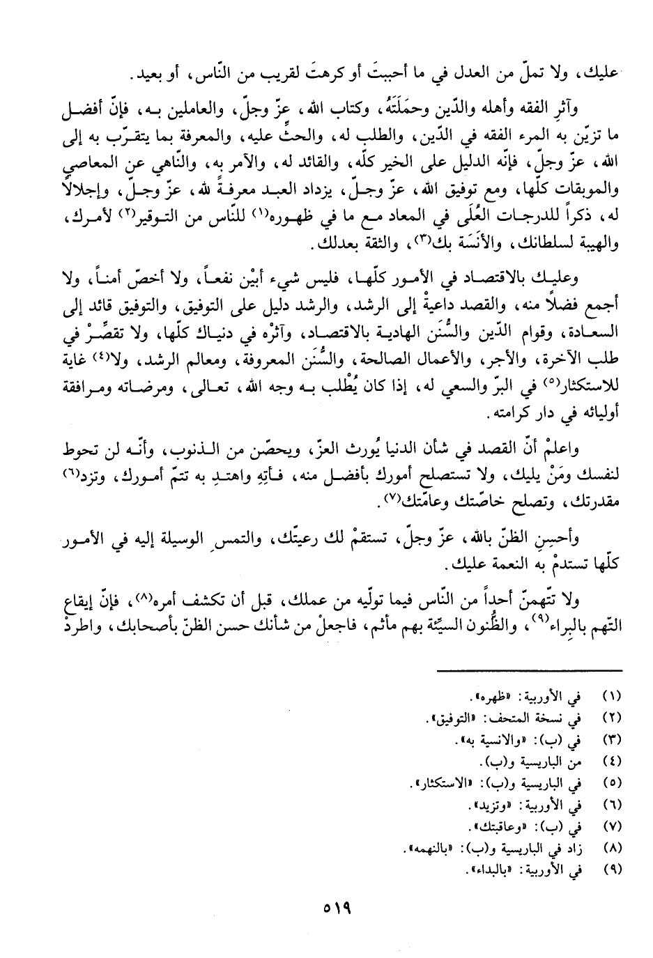 وَعَلَيْكَ بِالِاقْتِصَادِ فِي الْأُمُورِ كُلِّهَا، فَلَيْسَ شَيْءٌ أَبْيَنَ نَفْعًا، وَلَا أَخَصَّ أَمْنًا، وَلَا أَجْمَعَ فَضْلًا مِنْهُ، وَالْقَصْدُ دَاعِيَةٌ إِلَى الرُّشْدِ، وَالرُّشْدُ دَلِيلٌ عَلَى التَّوْفِيقِ، وَالتَّوْفِيقُ قَائِدٌ إِلَى السَّعَادَةِ، وَقِوَامُ الدِّينِ وَالسُّنَنِ الْهَادِيَةُ بِالِاقْتِصَادِ، وَآثِرْهُ فِي دُنْيَاكَ كُلِّهَا، وَلَا تُقَصِّرْ فِي طَلَبِ الْآخِرَةِ، وَالْأَجْرِ، وَالْأَعْمَالِ الصَّالِحَةِ، وَالسُّنَنِ الْمَعْرُوفَةِ، وَمَعَالِمِ الرُّشْدِ، وَلَا غَايَةَ لِلِاسْتِكْثَارِ فِي الْبِرِّ وَالسَّعْيِ لَهُ إِذَا كَانَ يُطْلَبُ بِهِ وَجْهُ اللَّهِ - تَعَالَى - وَمَرْضَاتُهُ وَمُرَافَقَةُ أَوْلِيَائِهِ فِي دَارِ كَرَامَتِهِ.