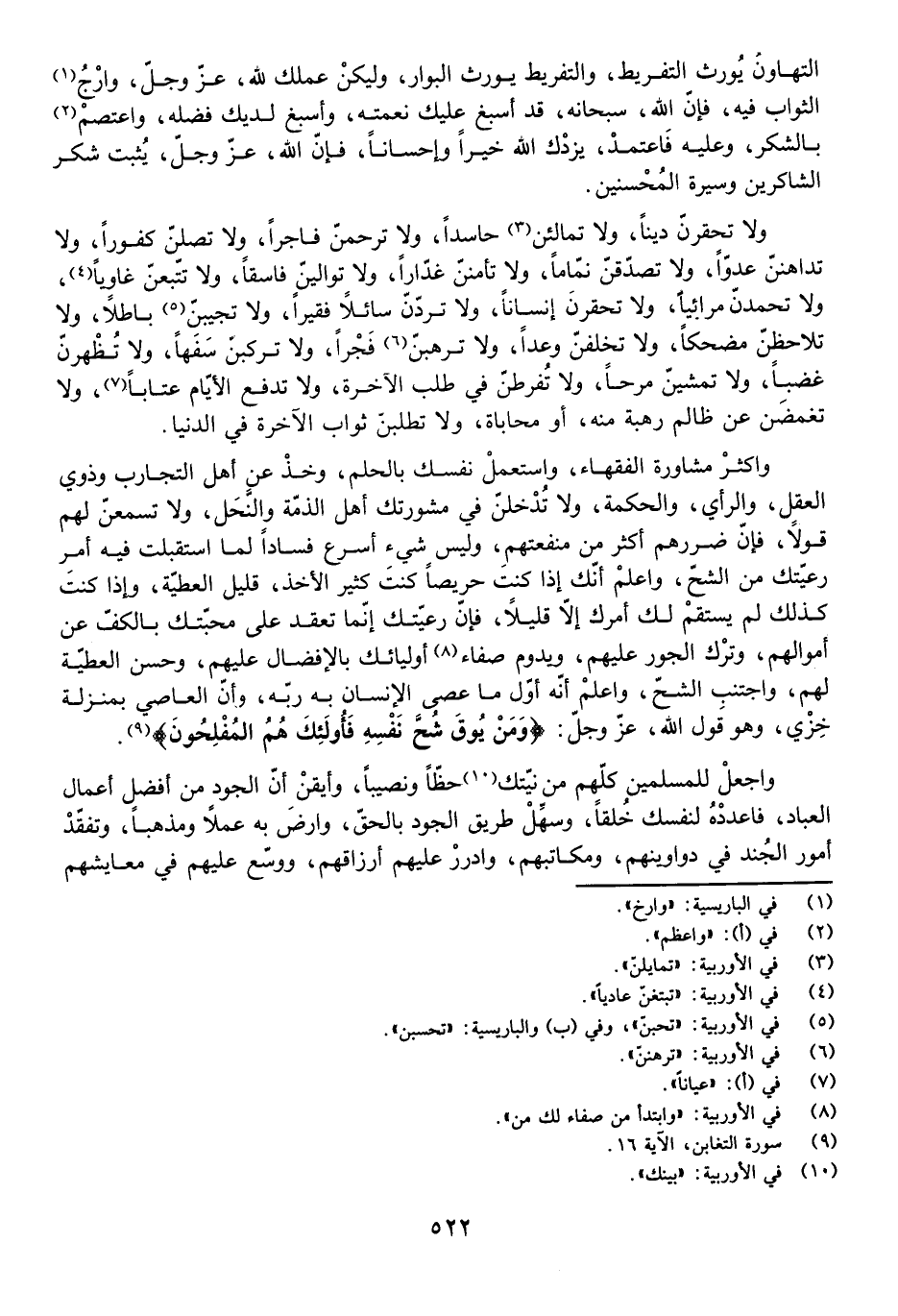 وَأَكْثِرْ مُشَاوَرَةَ الْفُقَهَاءِ، وَاسْتَعْمِلْ نَفْسَكَ بِالْحِلْمِ، وَخُذْ عَنْ أَهْلِ التَّجَارُبِ وَذَوِي الْعَقْلِ، وَالرَّأْيِ، وَالْحِكْمَةِ، وَلَا تُدْخِلَنَّ فِي مَشُورَتِكَ أَهْلَ الذِّمَّةِ وَالنِّحَلِ، وَلَا تَسْمَعَنَّ لَهُمْ قَوْلًا، فَإِنَّ ضَرَرَهُمْ أَكْثَرُ مِنْ مَنْفَعَتِهِمْ، وَلَيْسَ شَيْءٌ أَسْرَعُ فَسَادًا لِمَا اسْتَقْبَلْتَ فِيهِ أَمْرَ رَعِيَّتِكَ مِنَ الشُّحِّ، وَاعْلَمْ أَنَّكَ إِذَا كُنْتَ حَرِيصًا كُنْتَ كَثِيرَ الْأَخْذِ، قَلِيلَ الْعَطِيَّةِ، وَإِذَا كُنْتَ كَذَلِكَ لَمْ يَسْتَقِمْ لَكَ أَمْرُكَ إِلَّا قَلِيلًا، فَإِنَّ رَعِيَّتَكَ إِنَّمَا تَعْقِدُ عَلَى مَحَبَّتِكَ بِالْكَفِّ عَنْ أَمْوَالِهِمْ، وَتَرْكِ الْجَوْرِ عَلَيْهِمْ، وَيَدُومُ صَفَاءُ أَوْلِيَائِكَ بِالْإِفْضَالِ عَلَيْهِمْ، وَحُسْنِ الْعَطِيَّةِ لَهُمْ، وَاجْتَنِبِ الشُّحَّ، وَاعْلَمْ أَنَّهُ أَوَّلُ مَا عَصَى الْإِنْسَانُ بِهِ رَبَّهُ، وَأَنَّ الْعَاصِيَ بِمَنْزِلَةِ خِزْيٍ، وَهُوَ قَوْلُ اللَّهِ - عَزَّ وَجَلَّ -: {وَمَنْ يُوقَ شُحَّ نَفْسِهِ فَأُولَئِكَ هُمُ الْمُفْلِحُونَ} [الحشر: 9] .
