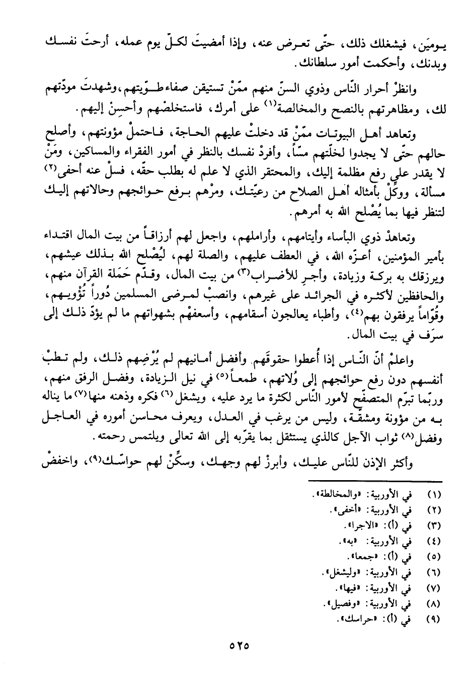 وَاعْلَمْ أَنَّ النَّاسَ إِذَا أُعْطُوا حُقُوقَهُمْ وَأَفْضَلَ أَمَانِيهِمْ - لَمْ يُرْضِهِمْ ذَلِكَ، وَلَمْ تَطِبْ أَنْفُسُهُمْ دُونَ رَفْعِ حَوَائِجِهِمْ إِلَى وُلَاتِهِمْ، طَمَعًا فِي نَيْلِ الزِّيَادَةِ، وَفَضْلِ الرِّفْقِ مِنْهُمْ، وَرُبَّمَا تَبَرَّمَ الْمُتَصَفِّحُ لِأُمُورِ النَّاسِ لِكَثْرَةِ مَا يَرِدُ عَلَيْهِ، وَيَشْغَلُ فِكْرَهُ وَذِهْنَهُ مِنْهَا مَا يَنَالُهُ بِهِ مِنْ مَئُونَةٍ وَمَشَقَّةٍ، وَلَيْسَ مَنْ يَرْغَبُ فِي الْعَدْلِ، وَيَعْرِفُ مَحَاسِنَ أُمُورِهِ فِي الْعَاجِلِ وَفَضْلِ ثَوَابِ الْآجِلِ - كَالَّذِي يَسْتَثْقِلُ بِمَا يُقَرِّبُهُ إِلَى اللَّهِ - تَعَالَى - وَيَلْتَمِسُ رَحْمَتَهُ.