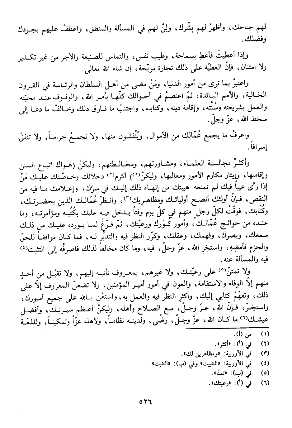 وَأَكْثِرْ مُجَالَسَةَ الْعُلَمَاءِ وَمُشَاوَرَتَهُمْ، وَمُخَالَطَتَهُمْ، وَلْيَكُنْ (هَوَاكَ اتِّبَاعَ السُّنَنِ وَإِقَامَتَهَا، وَإِيثَارَ مَكَارِمِ الْأُمُورِ وَمَعَالِيهَا، وَلْيَكُنْ) أَكْرَمُ دُخَلَائِكَ وَخَاصَّتِكَ عَلَيْكَ مَنْ إِذَا رَأَى عَيْبًا فِيكَ لَمْ تَمْنَعْهُ هَيْبَتُكَ مِنْ إِنْهَاءِ ذَلِكَ إِلَيْكَ فِي سِرِّكَ، وَإِعْلَامِكَ مَا فِيهِ مِنَ النَّقْصِ، فَإِنَّ أُولَئِكَ أَنْصَحُ أَوْلِيَائِكَ وَمُظَاهِرِيكَ، وَانْظُرْ عُمَّالَكَ الَّذِينَ بِحَضْرَتِكَ، وَكُتَّابَكَ، فَوَقِّتْ لِكُلِّ رَجُلٍ مِنْهُمْ فِي كُلِّ يَوْمٍ وَقْتًا يَدْخُلُ فِيهِ عَلَيْكَ بِكُتُبِهِ وَمُؤَامَرَتِهِ، وَمَا عِنْدَهُ مِنْ حَوَائِجِ عُمَّالِكَ، وَأُمُورِ كُوَرِكَ وَرَعِيَّتِكَ، ثُمَّ فَرِّغْ لِمَا يُورِدُهُ عَلَيْكَ مِنْ ذَلِكَ سَمْعَكَ، وَبَصَرَكَ، وَفَهْمَكَ، وَعَقْلَكَ، وَكَرِّرِ النَّظَرَ فِيهِ وَالتَّدَبُّرَ لَهُ، فَمَا كَانَ مُوَافِقًا لِلْحَقِّ وَالْحَزْمِ فَأَمْضِهِ، وَاسْتَخِرِ اللَّهَ - عَزَّ وَجَلَّ - فِيهِ، وَمَا كَانَ مُخَالِفًا لِذَلِكَ فَاصْرِفْهُ إِلَى التَّثَبُّتِ فِيهِ وَالْمَسْأَلَةِ عَنْهُ.