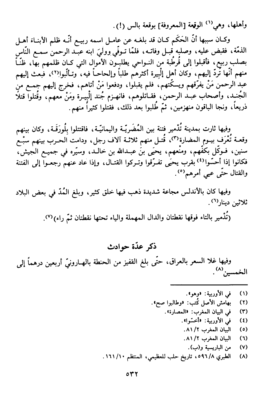 وَفِيهَا ثَارَتْ بِمَدِينَةِ تُدْمِيرَ فِتْنَةٌ بَيْنَ الْمُضَرِيَّةِ وَالْيَمَانِيَّةِ، فَاقْتَتَلُوا بِلُورَقَةَ، وَكَانَ بَيْنَهُمْ وَقْعَةٌ تُعْرَفُ بِيَوْمِ الْمَضَارَّةِ، قُتِلَ مِنْهُمْ ثَلَاثَةُ آلَافِ رَجُلٍ، وَدَامَتِ الْحَرْبُ بَيْنَهُمْ سَبْعَ سِنِينَ، فَوَكَّلَ بِكَفِّهِمْ وَمَنْعِهِمْ يَحْيَى بْنَ عَبْدِ اللَّهِ بْنِ خَالِدٍ، وَسَيَّرَهُ فِي جَمِيعِ الْجَيْشِ، فَكَانُوا إِذَا أَحَسُّوا بِقُرْبِ يَحْيَى تَفَرَّقُوا وَتَرَكُوا الْقِتَالَ، وَإِذَا عَادَ عَنْهُمْ رَجَعُوا إِلَى الْفِتْنَةِ وَالْقِتَالِ حَتَّى عَيِيَ أَمْرَهُمْ.