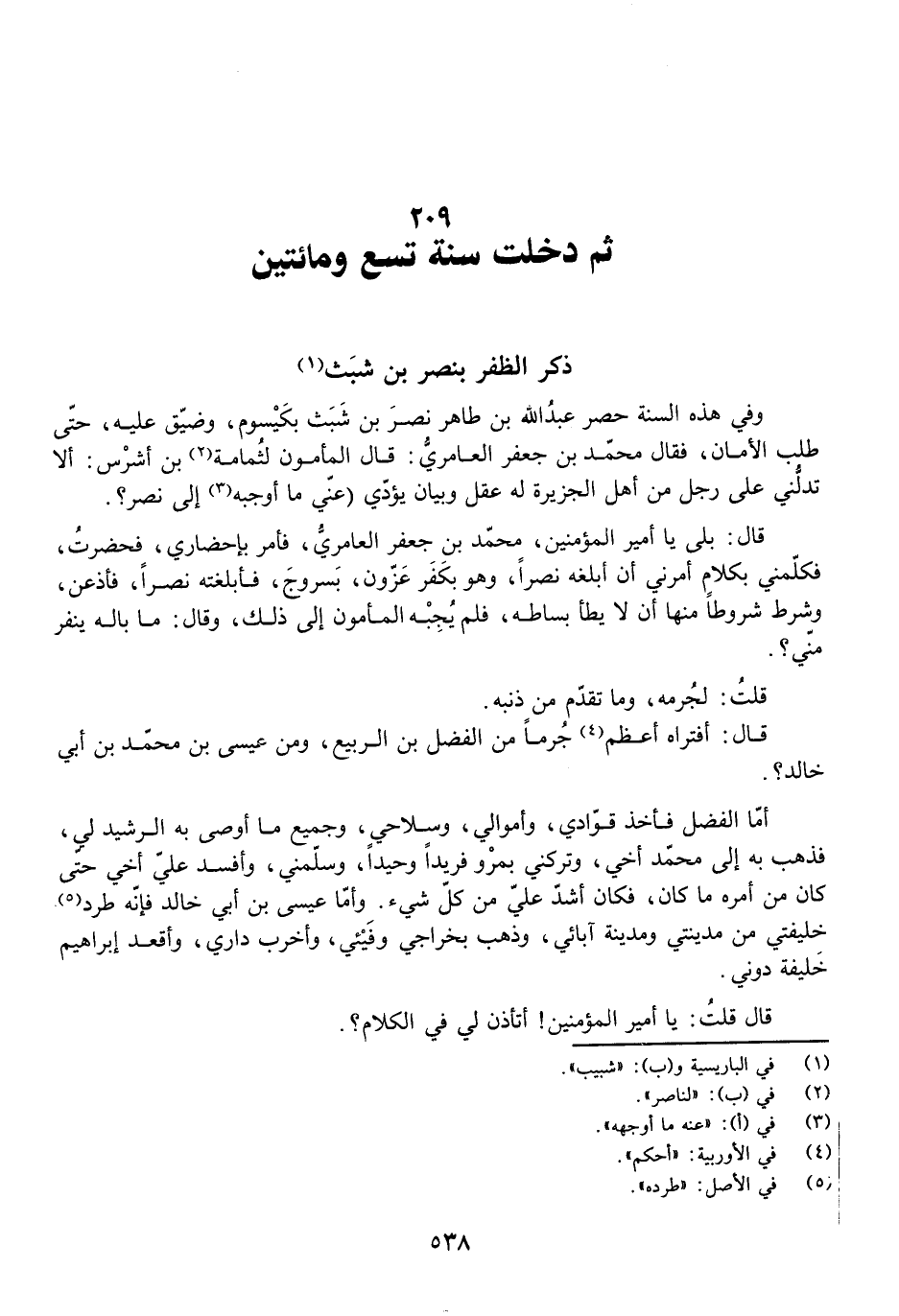 وَفِي هَذِهِ السَّنَةِ حَصَرَ عَبْدُ اللَّهِ بْنُ طَاهِرٍ نَصْرَ بْنَ شَبَثٍ بِكَيْسُومَ، وَضَيَّقَ عَلَيْهِ، حَتَّى طَلَبَ الْأَمَانَ، فَقَالَ مُحَمَّدُ بْنُ جَعْفَرٍ الْعَامِرِيُّ: قَالَ الْمَأْمُونُ لِثُمَامَةَ بْنِ أَشْرَسَ: أَلَا تَدُلُّنِي عَلَى رَجُلٍ مِنْ أَهْلِ الْجَزِيرَةِ لَهُ عَقْلٌ وَبَيَانٌ يُؤَدِّي (عَنِّي مَا أُوجِبُهُ إِلَى نَصْرٍ؟