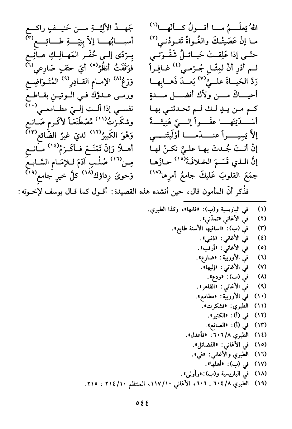 فَذُكِرَ أَنَّ الْمَأْمُونَ قَالَ حِينَ أَنْشَدَهُ هَذِهِ الْقَصِيدَةَ: أَقُولُ كَمَا قَالَ يُوسُفُ لِإِخْوَتِهِ: