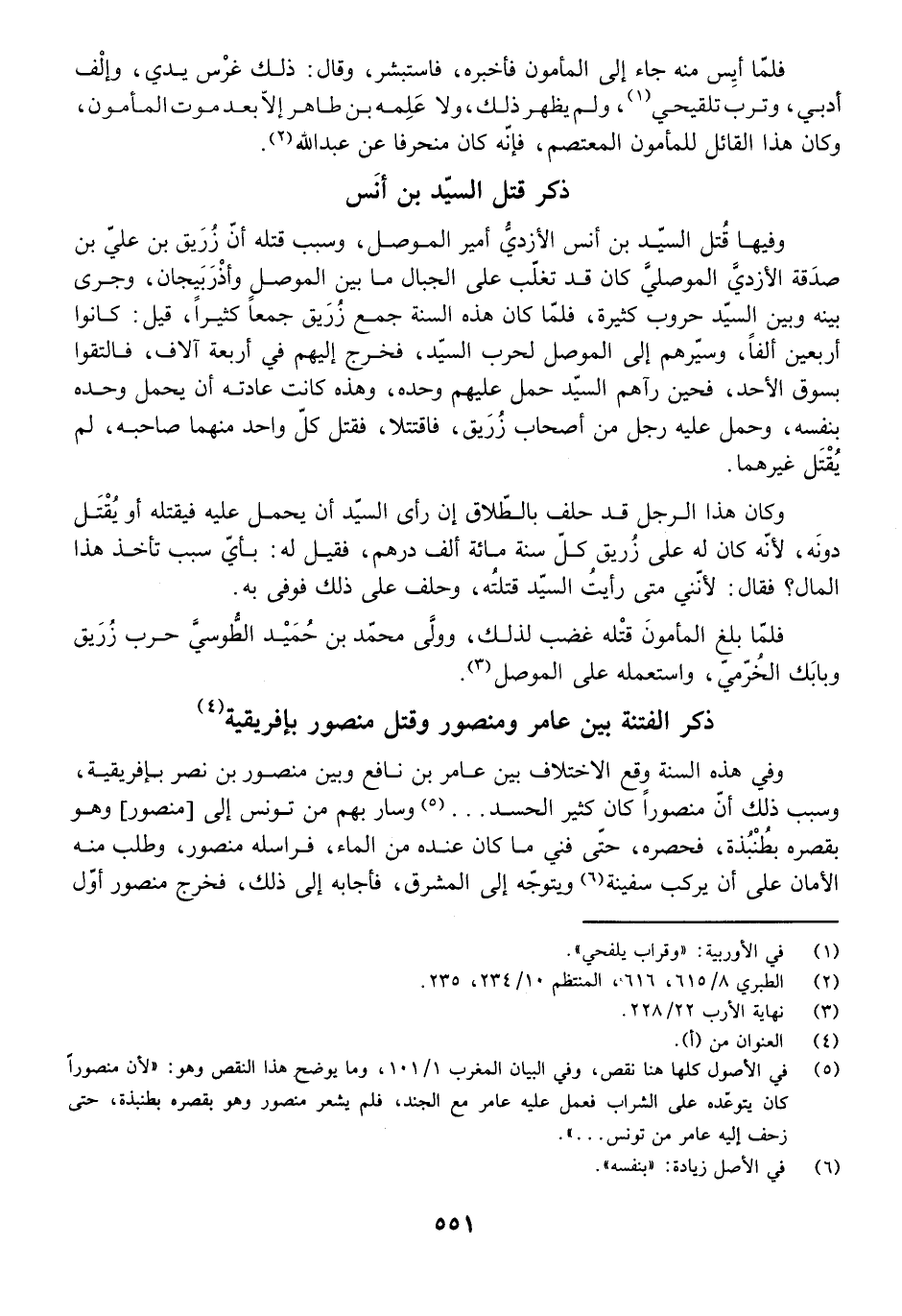 وَفِيهَا قُتِلَ السَّيِّدُ بْنُ أَنَسٍ الْأَزْدِيُّ أَمِيرُ الْمَوْصِلِ، وَسَبَبُ قَتْلِهِ أَنَّ زُرَيْقَ بْنَ عَلِيِّ بْنِ صَدَقَةَ الْأَزْدِيَّ الْمَوْصِلِيَّ كَانَ قَدْ تَغَلَّبَ عَلَى الْجِبَالِ مَا بَيْنَ الْمَوْصِلِ وَأَذْرَبِيجَانَ، وَجَرَى بَيْنَهُ وَبَيْنَ السَّيِّدِ حُرُوبٌ كَثِيرَةٌ، فَلَمَّا كَانَ هَذِهِ السَّنَةَ جَمَعَ زُرَيْقٌ جَمْعًا كَثِيرًا، قِيلَ: كَانُوا أَرْبَعِينَ أَلْفًا، وَسَيَّرَهُمْ إِلَى الْمَوْصِلِ لِحَرْبِ السَّيِّدِ، فَخَرَجَ إِلَيْهِمْ فِي أَرْبَعَةِ آلَافٍ، فَالْتَقَوْا بِسُوقِ الْأَحَدِ، فَحِينَ رَآهُمُ السَّيِّدُ حَمَلَ عَلَيْهِمْ وَحْدَهُ، وَهَذِهِ كَانَتْ عَادَتُهُ أَنْ يَحْمِلَ وَحْدَهُ بِنَفْسِهِ، وَحَمَلَ عَلَيْهِ رَجُلٌ مِنْ أَصْحَابِ زُرَيْقٍ، فَاقْتَتَلَا، فَقَتَلَ كُلُّ وَاحِدٍ مِنْهُمَا صَاحِبَهُ، لَمْ يُقْتَلْ غَيْرُهُمَا.