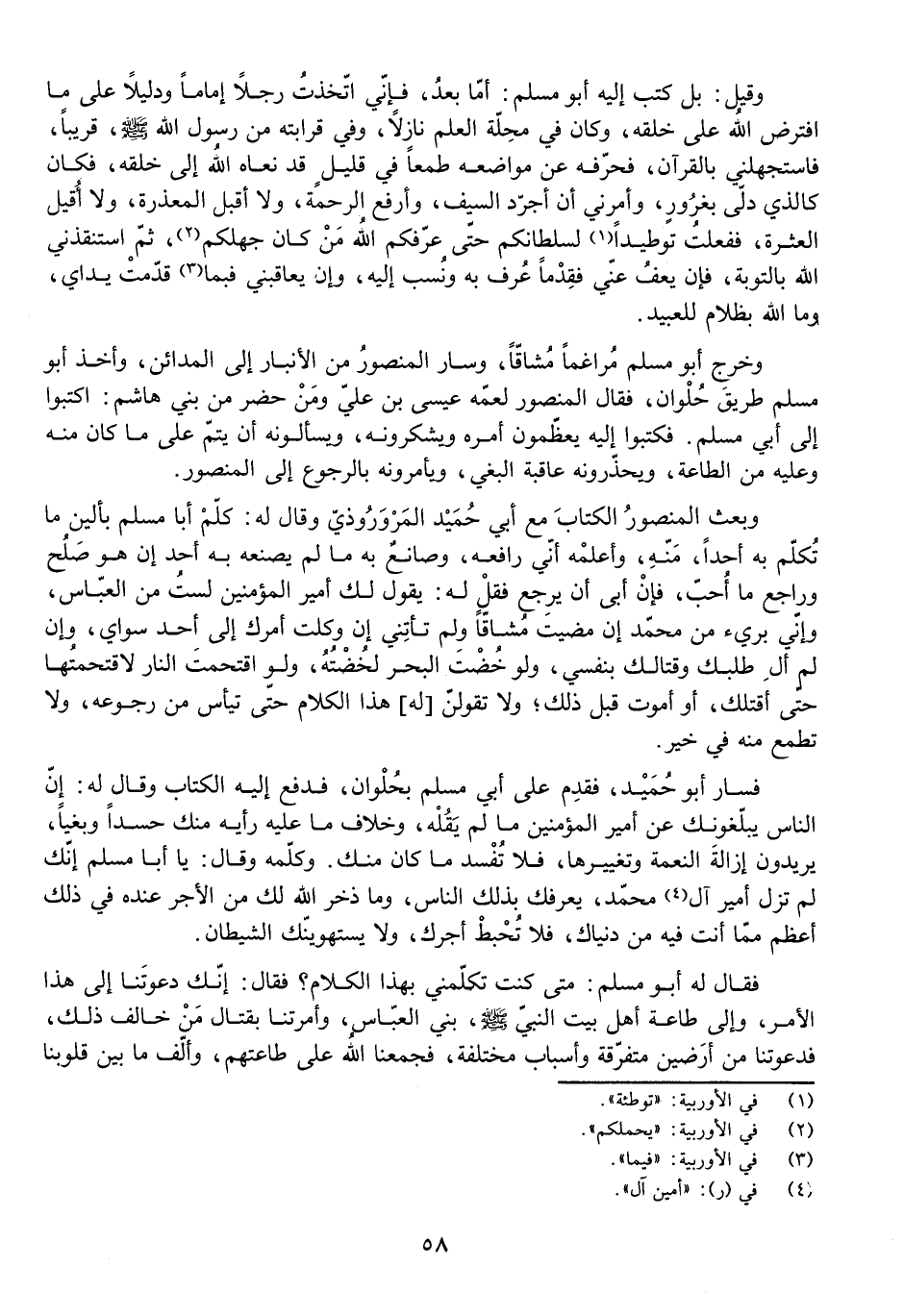 وَقِيلَ: بَلْ كَتَبَ إِلَيْهِ أَبُو مُسْلِمٍ: أَمَّا بَعْدُ فَإِنِّي اتَّخَذْتُ رَجُلًا إِمَامًا وَدَلِيلًا عَلَى مَا افْتَرَضَ اللَّهُ عَلَى خَلْقِهِ، وَكَانَ فِي مَحِلَّةِ الْعِلْمِ نَازِلًا، وَفِي قَرَابَتِهِ مِنْ رَسُولِ اللَّهِ - صَلَّى اللَّهُ عَلَيْهِ وَسَلَّمَ - قَرِيبًا، فَاسْتَجْهَلَنِي بِالْقُرْآنِ، فَحَرَّفَهُ عَنْ مَوَاضِعِهِ طَمَعًا فِي قَلِيلٍ قَدْ نَعَاهُ اللَّهُ إِلَى خَلْقِهِ، فَكَانَ كَالَّذِي دَلَّى بِغُرُورٍ، وَأَمَرَنِي أَنْ أُجَرِّدَ السَّيْفَ، وَأَرْفَعَ الرَّحْمَةَ، وَلَا أَقْبَلَ الْمَعْذِرَةَ، وَلَا أُقِيلَ الْعَثْرَةَ، فَفَعَلْتُ تَوْطِيدًا لِسُلْطَانِكُمْ حَتَّى عَرَّفَكُمُ اللَّهُ مَنْ كَانَ جَهِلَكُمْ، ثُمَّ اسْتَنْقَذَنِيَ اللَّهُ بِالتَّوْبَةِ، فَإِنْ يَعْفُ عَنِّي فَقِدْمًا عُرِفَ بِهِ وَنُسِبَ إِلَيْهِ، وَإِنْ يُعَاقِبْنِي فَبِمَا قَدَّمَتْ يَدَايَ، وَمَا اللَّهُ بِظَلَّامٍ لِلْعَبِيدِ.