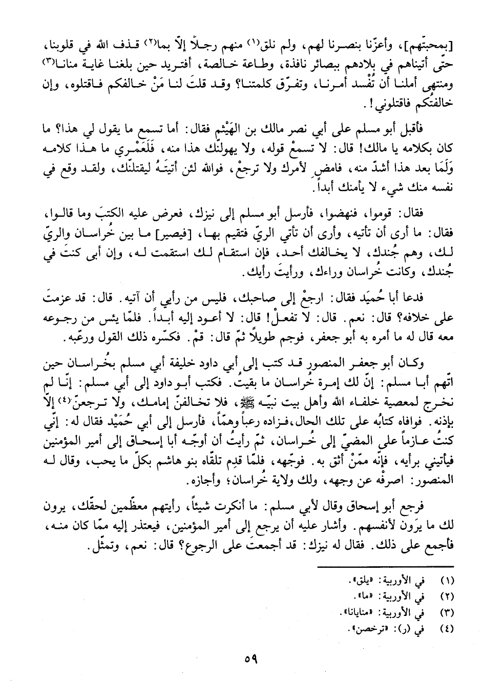 فَأَقْبَلَ أَبُو مُسْلِمٍ عَلَى أَبِي نَصْرٍ مَالِكِ بْنِ الْهَيْثَمِ، فَقَالَ: أَمَا تَسْمَعُ مَا يَقُولُ لِي هَذَا؟ مَا كَانَ بِكَلَامِهِ يَا مَالِكُ! قَالَ: لَا تَسْمَعْ قَوْلَهُ، وَلَا يَهُولَنَّكَ هَذَا مِنْهُ، فَلَعَمْرِي مَا هَذَا كَلَامَهُ، وَلَمَا بَعْدَ هَذَا أَشَدُّ مِنْهُ، فَامْضِ لِأَمْرِكَ وَلَا تَرْجِعْ، فَوَاللَّهِ لَئِنْ أَتَيْتَهُ لَيَقْتُلَنَّكَ، وَلَقَدْ وَقَعَ فِي نَفْسِهِ مِنْكَ شَيْءٌ لَا يَأْمَنُكَ أَبَدًا.
