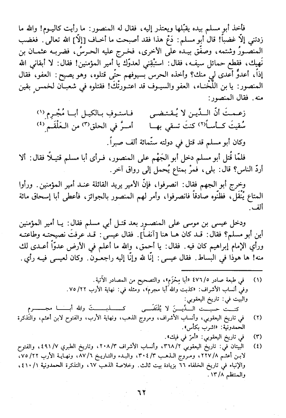 فَأَخَذَ أَبُو مُسْلِمٍ بِيَدِهِ يُقَبِّلُهَا وَيَعْتَذِرُ إِلَيْهِ، فَقَالَ لَهُ الْمَنْصُورُ: مَا رَأَيْتُ كَالْيَوْمِ! وَاللَّهِ مَا زِدْتَنِي إِلَّا غَضَبًا! قَالَ أَبُو مُسْلِمٍ: دَعْ هَذَا فَقَدَ أَصْبَحْتُ مَا أَخَافُ [إِلَّا] اللَّهَ تَعَالَى.