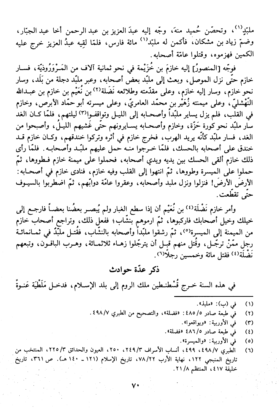 وَسَارَ إِلَيْهِ خَازِمٌ وَعَلَى مُقَدِّمَتِهِ وَطَلَائِعِهِ نَضَلَةُ بْنُ نُعَيْمِ بْنِ خَازِمِ بْنِ عَبْدِ اللَّهِ النَّهْشَلِيُّ، وَعَلَى مَيْمَنَتِهِ زُهَيْرُ بْنُ مُحَمَّدٍ الْعَامِرِيُّ، وَعَلَى مَيْسَرَتِهِ أَبُو حَمَّادٍ الْأَبْرَصُ، وَخَازِمٌ فِي الْقَلْبِ.