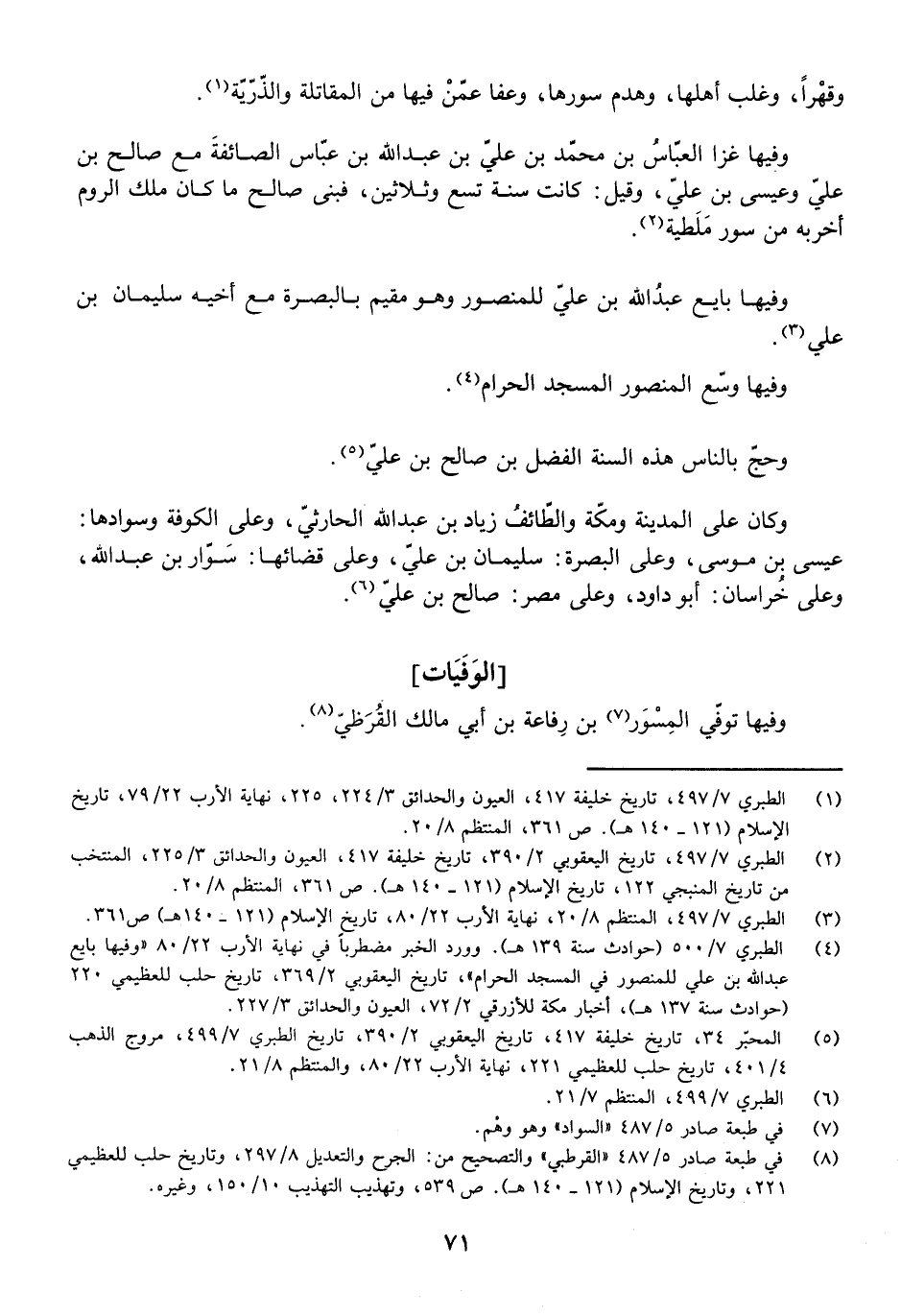 وَفِيهَا بَايَعَ عَبْدُ اللَّهِ بْنُ عَلِيٍّ لِلْمَنْصُورِ وَهُوَ مُقِيمٌ بِالْبَصْرَةِ مَعَ أَخِيهِ سُلَيْمَانَ بْنِ عَلِيٍّ. وَفِيهَا وَسَّعَ الْمَنْصُورُ الْمَسْجِدَ الْحَرَامَ.
