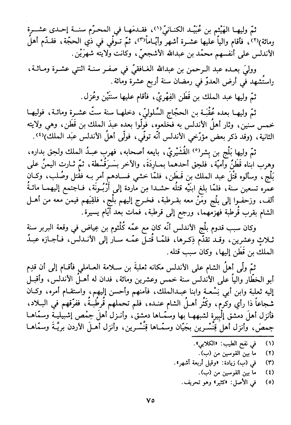 ثُمَّ وَلِيَهَا بَلْجُ بْنُ بِشْرٍ الْقُشَيْرِيُّ، بَايَعَهُ أَصْحَابُهُ، فَهَرَبَ عَبْدُ الْمَلِكِ وَلَحِقَ بِدَارِهِ، وَهَرَبَ ابْنَاهُ قَطَنٌ وَأُمَيَّةُ فَلَحِقَ أَحَدُهُمَا بِمَارِدَةَ وَالْآخَرُ بِسَرَقُسْطَةَ، ثُمَّ ثَارَتِ الْيَمَنُ عَلَى بَلْجٍ وَسَأَلُوهُ قَتْلَ عَبْدِ الْمَلِكِ بْنِ قَطَنٍ، فَلَمَّا خَشِيَ فَسَادَهُمْ أَمَرَ بِهِ فَقُتِلَ وَصُلِبَ، وَكَانَ عُمُرُهُ تِسْعِينَ سَنَةً.
