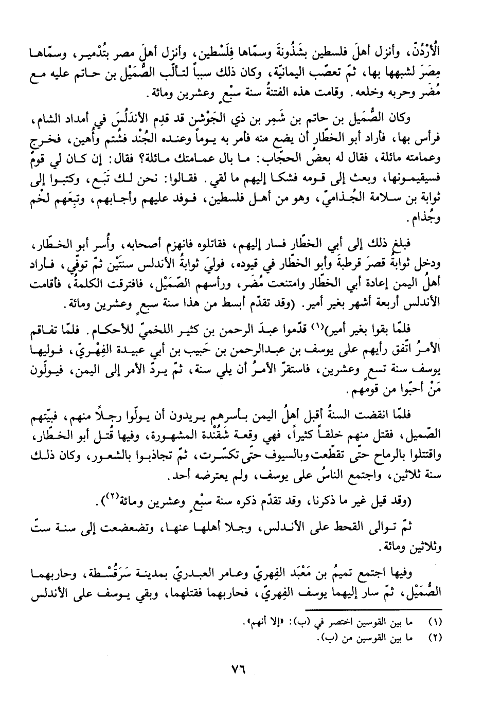 ثُمَّ تَوَالَى الْقَحْطُ عَلَى الْأَنْدَلُسِ، وَجَلَا أَهْلُهَا عَنْهَا وَتَضَعْضَعَتْ إِلَى سَنَةِ سِتٍّ وَثَلَاثِينَ وَمِائَةٍ، وَفِيهَا اجْتَمَعَ تَمِيمُ بْنُ مَعْبَدٍ الْفِهْرِيُّ، وَعَامِرٌ الْعَبْدَرِيُّ بِمَدِينَةِ سَرَقُسْطَةَ، وَحَارَبَهُمَا الصُّمَيْلُ، ثُمَّ سَارَ إِلَيْهِمَا يُوسُفُ الْفِهْرِيُّ فَحَارَبَهُمَا فَقَتَلَهُمَا، وَبَقِيَ يُوسُفُ عَلَى الْأَنْدَلُسِ