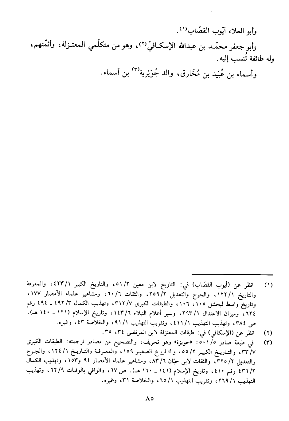 وَأَبُو الْعَلَاءِ أَيُّوبُ الْقَصَّابُ. وَأَبُو جَعْفَرٍ مُحَمَّدُ بْنُ عَبْدِ اللَّهِ الْإِسْكَافِيُّ، وَهُوَ مِنْ مُتَكَلِّمِي الْمُعْتَزِلَةِ، وَأَئِمَّتِهِمْ، وَلَهُ طَائِفَةٌ تُنْسَبُ إِلَيْهِ. وَأَسْمَاءُ بْنُ عُبَيْدِ بْنِ مُخَارِقٍ، وَالِدُ جُوَيْرِيَةَ بْنِ أَسْمَاءٍ.
