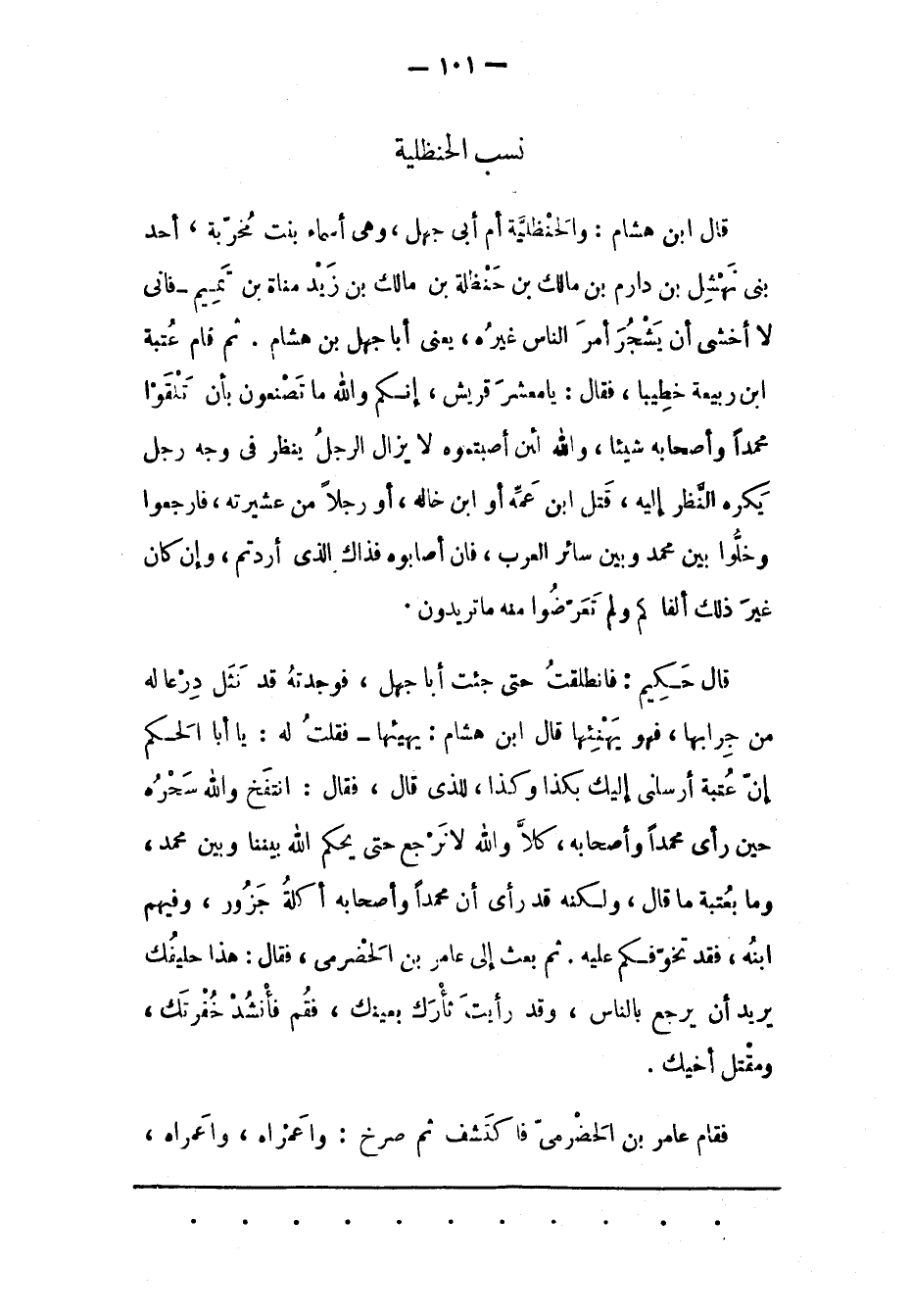 قال ابن هشام: وَالْحَنْظَلِيّةُ أُمّ أَبِي جَهْلٍ، وَهِيَ أَسَمَاءُ بِنْتُ مُخَرّبَةَ، أَحَدُ بَنِي نَهْشِلْ بْنِ دَارِمِ بْنِ مالك بن حنظلة بن مالك بن زيد مَنَاةَ بْنِ تَمِيمٍ- فَإِنّي لَا أَخْشَى أَنْ يَشْجُرَ أَمْرَ النّاسِ غَيْرُهُ، يَعْنِي أَبَا جَهْلِ بن هشام. ثم قام عتبة ابن رَبِيعَةَ خَطِيبًا، فَقَالَ: يَا مَعْشَرَ قُرَيْشٍ، إنّكُمْ وَاَللهِ مَا تَصْنَعُونَ بِأَنْ تَلَقّوْا مُحَمّدًا وَأَصْحَابَهُ شَيْئًا، وَاَللهِ لَئِنْ أَصَبْتُمُوهُ لَا يَزَالُ الرّجُلُ يَنْظُرُ فِي وَجْهِ رَجُلٍ يَكْرَهُ النّظَرَ إلَيْهِ، قَتَلَ ابْنَ عَمّهِ أَوْ ابْنَ خَالِهِ، أَوْ رَجُلًا مِنْ عَشِيرَتِهِ، فَارْجِعُوا وَخَلّوا بَيْنَ مُحَمّدٍ وَبَيْنَ سَائِرِ الْعَرَبِ، فَإِنْ أَصَابُوهُ فَذَاكَ الّذِي أَرَدْتُمْ، وَإِنْ كَانَ غَيْرَ ذَلِكَ أَلْفَاكُمْ وَلَمْ تَعَرّضُوا مِنْهُ مَا تُرِيدُونَ.