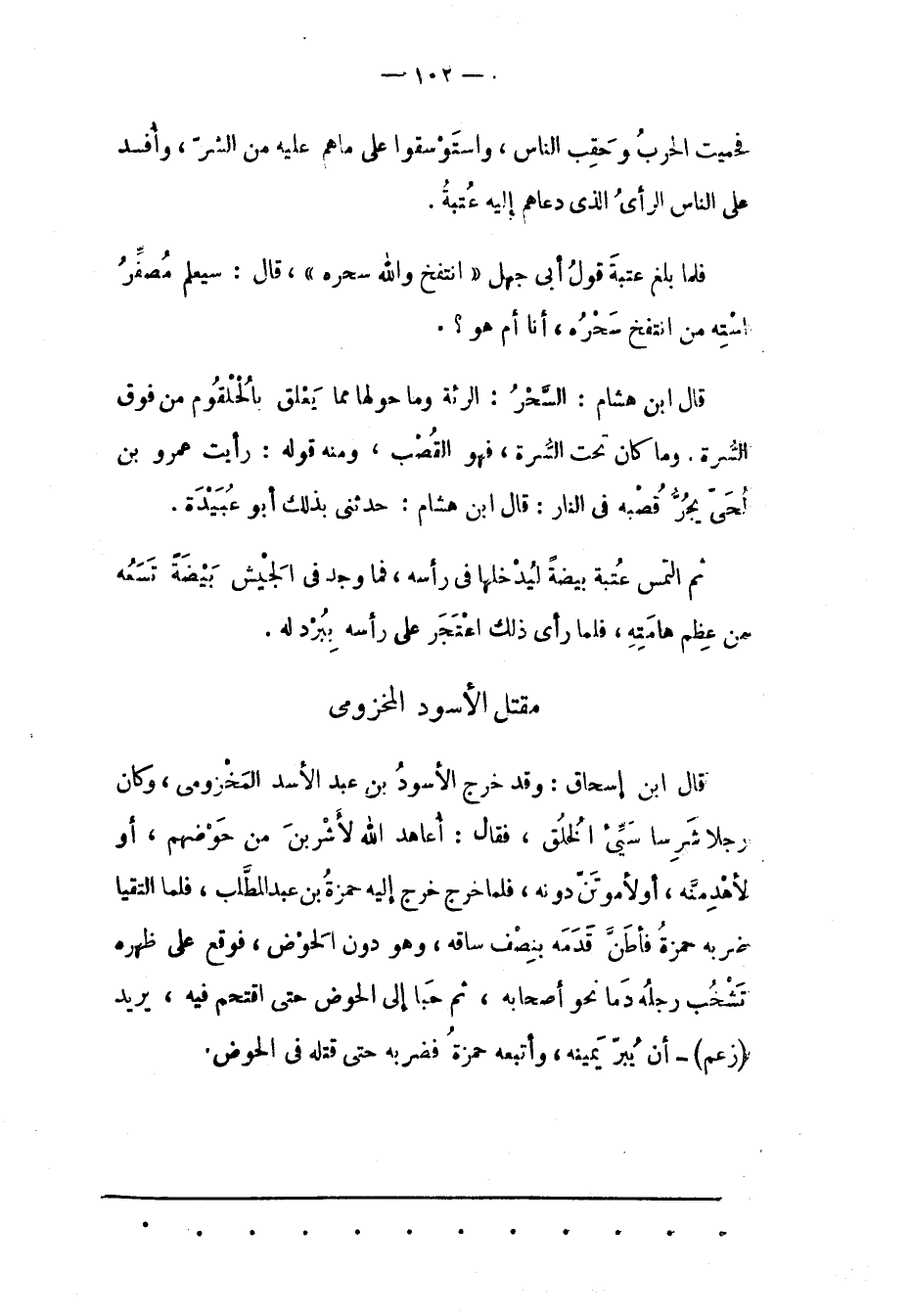 قَالَ ابْنُ إسْحَاقَ: وَقَدْ خَرَجَ الْأَسْوَدُ بْنُ عَبْدِ الْأَسَدِ الْمَخْزُومِيّ، وَكَانَ رَجُلًا شَرِسًا سَيّئَ الْخُلُقِ، فَقَالَ: أُعَاهِدُ اللهَ لأشربن من حوضهم، أو لأهد منّه، أَوْ لَأَمُوتَنّ دُونَهُ، فَلَمّا خَرَجَ خَرَجَ إلَيْهِ حَمْزَةُ بْنُ عَبْدِ الْمُطّلِبِ، فَلَمّا الْتَقَيَا ضَرَبَهُ حَمْزَةُ فَأَطَنّ قَدَمَهُ بِنِصْفِ سَاقِهِ، وَهُوَ دُونَ الْحَوْضِ، فَوَقَعَ عَلَى ظَهْرِهِ تَشْخَبُ رِجْلُهُ دَمًا نَحْوَ أَصْحَابِهِ، ثُمّ حَبَا إلَى الْحَوْضِ حَتّى اقتحم فيه، يريد (زَعَمَ) - أَنْ يُبِرّ يَمِينَهُ، وَأَتْبَعَهُ حَمْزَةُ فَضَرَبَهُ حَتّى قَتَلَهُ فِي الْحَوْضِ.