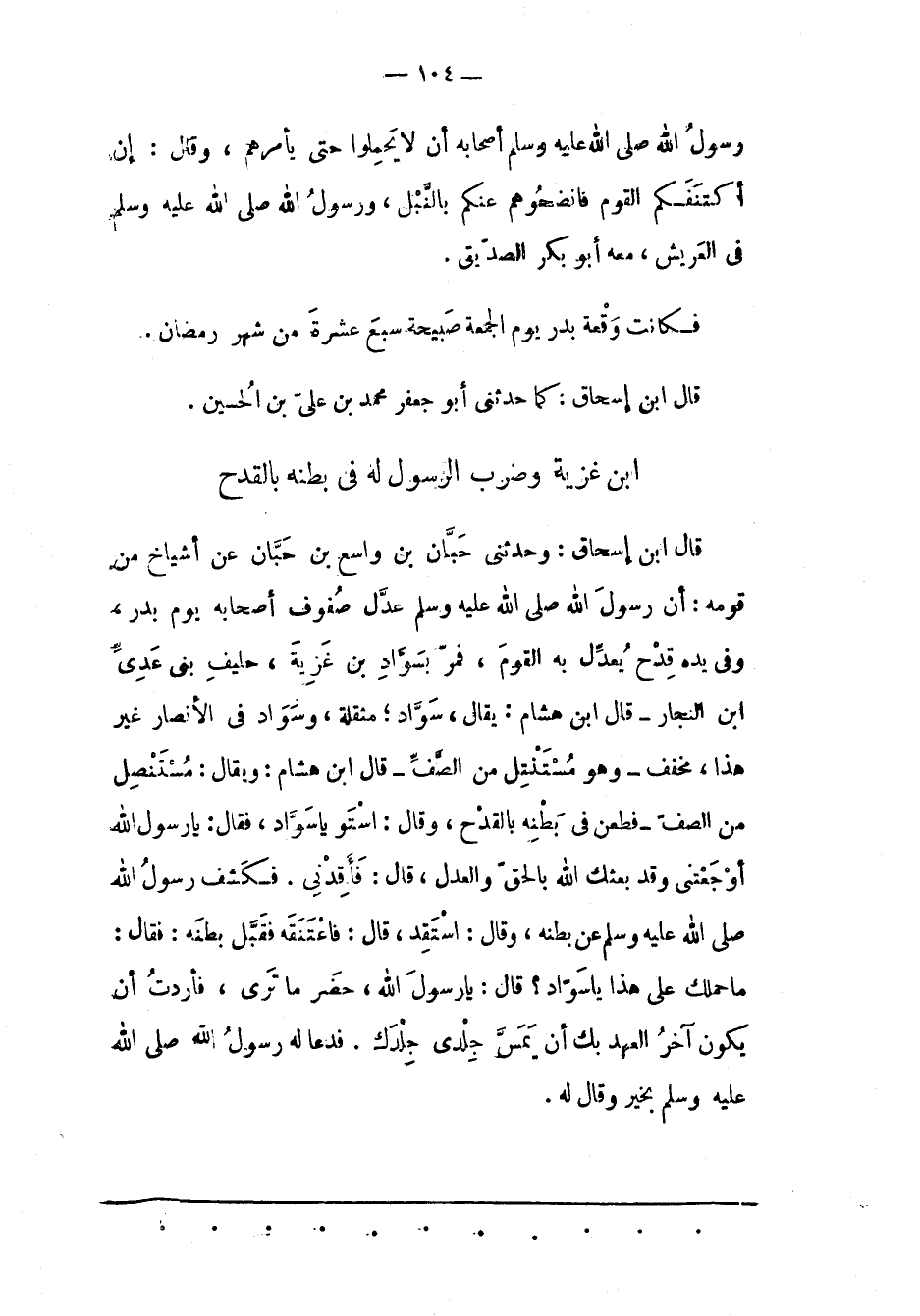 قَالَ ابْنُ إسْحَاقَ: وَحَدّثَنِي حِبّانُ بْنُ وَاسِعِ بْنِ حِبّانَ عَنْ أَشْيَاخٍ مِنْ قَوْمِهِ: أن رسول الله صلى الله عليه وسلم عَدّلَ صُفُوفَ أَصْحَابِهِ يَوْمَ بَدْرٍ، وَفِي يَدِهِ قِدْحٌ يُعَدّلُ بِهِ الْقَوْمَ، فَمَرّ بِسَوَادِ بْنِ غزية، حليف بنى عدىّ ابن النّجّارِ- قَالَ ابْنُ هِشَامٍ: يُقَالُ، سَوّادٌ؛ مُثَقّلَةٌ، وَسَوَادٌ فِي الْأَنْصَارِ غَيْرُ هَذَا، مُخَفّفٌ- وَهُوَ مُسْتَنْتِلٌ مِنْ الصّفّ- قَالَ ابْنُ هِشَامٍ: وَيُقَالُ: مُسْتَنْصِلٌ مِنْ الصّفّ- فَطُعِنَ فِي بَطْنِهِ بِالْقِدْحِ، وقال: استو ياسوّاد، فَقَالَ: يَا رَسُولَ اللهِ أَوْجَعْتنِي وَقَدْ بَعَثَك اللهُ بِالْحَقّ وَالْعَدْلِ، قَالَ: فَأَقِدْنِي. فَكَشَفَ رَسُولُ اللهِ صَلّى اللهُ عَلَيْهِ وَسَلّمَ عَنْ بَطْنِهِ، وَقَالَ: اسْتَقِدْ، قَالَ: فَاعْتَنَقَهُ فَقَبّلَ بَطْنَهُ: فَقَالَ: