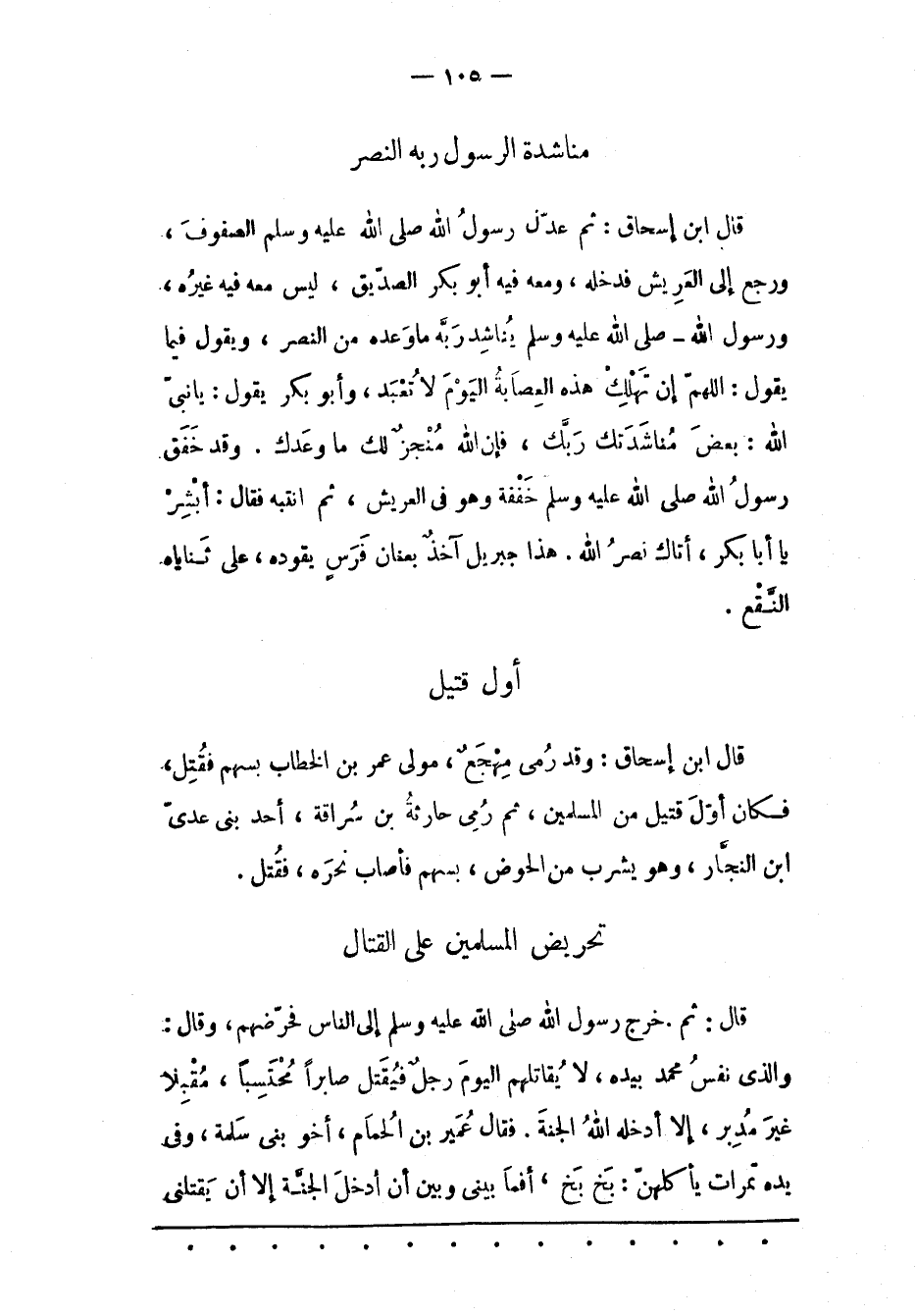 قَالَ ابْنُ إسْحَاقَ: ثُمّ عَدّلَ رَسُولُ اللهِ صَلّى اللهُ عَلَيْهِ وسلم الصفوف، ورجع إلى العريش فَدَخَلَهُ، وَمَعَهُ فِيهِ أَبُو بَكْرٍ الصّدّيقُ، لَيْسَ مَعَهُ فِيهِ غَيْرُهُ، وَرَسُولُ اللهِ- صَلّى اللهُ عَلَيْهِ وَسَلّمَ يُنَاشِدُ رَبّهُ مَا وَعَدَهُ مِنْ النّصْرِ، وَيَقُولُ فِيمَا يَقُولُ: اللهُمّ إنْ تَهْلِكْ هَذِهِ الْعِصَابَةُ الْيَوْمَ لَا تُعْبَدْ، وَأَبُو بَكْرٍ يَقُولُ: يَا نَبِيّ اللهِ: بَعْضَ مُنَاشَدَتُك رَبّك، فَإِنّ اللهَ مُنَجّزٌ لَك مَا وَعَدَك. وَقَدْ خَفَقَ رَسُولُ اللهِ صَلّى اللهُ عَلَيْهِ وَسَلّمَ خففة وَهُوَ فِي الْعَرِيشِ، ثُمّ انْتَبَهَ فَقَالَ: أَبْشِرْ يَا أَبَا بَكْرٍ، أَتَاك نَصْرُ اللهِ. هَذَا جِبْرِيلُ آخِذٌ بِعَنَانِ فَرَسٍ يَقُودُهُ، عَلَى ثَنَايَاهُ النّقع.