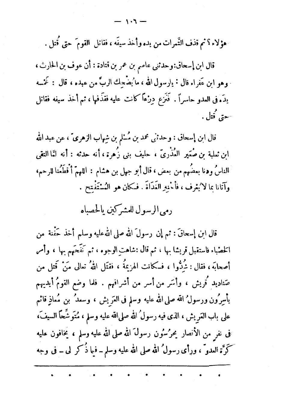 قَالَ ابْنُ إسْحَاقَ: ثُمّ إنّ رَسُولَ اللهِ صَلّى اللهُ عَلَيْهِ وَسَلّمَ أَخَذَ حَفْنَةً مِنْ الْحَصْبَاءِ فَاسْتَقْبَلَ قُرَيْشًا بِهَا، ثُمّ قَالَ: شَاهَتْ الْوُجُوهُ، ثُمّ نَفَحَهُمْ بِهَا، وَأَمَرَ أَصْحَابَهُ، فَقَالَ: شِدّوا، فَكَانَتْ الْهَزِيمَةُ، فَقَتَلَ اللهُ تَعَالَى مَنْ قُتِلَ مِنْ صَنَادِيدِ قُرَيْشٍ، وَأَسَرَ مَنْ أَسَرَ مِنْ أَشْرَافِهِمْ. فَلَمّا وَضَعَ الْقَوْمُ أَيْدِيَهُمْ يَأْسِرُونَ وَرَسُولُ اللهِ صَلَّى اللَّهُ عَلَيْهِ وَسَلَّمَ فِي الْعَرِيشِ، وَسَعْدُ بْنُ مُعَاذٍ قَائِمٌ عَلَى بَابِ الْعَرِيشِ، الّذِي فِيهِ رَسُولُ اللهِ صَلَّى اللَّهُ عَلَيْهِ وَسَلَّمَ، متوشّحا السّيْفِ، فِي نَفَرٍ مِنْ الْأَنْصَارِ يَحْرُسُونَ رَسُولَ اللهِ صَلّى اللهُ عَلَيْهِ وَسَلّمَ، يَخَافُونَ عَلَيْهِ كَرّةَ الْعَدُوّ، وَرَأَى رَسُولُ اللهِ صَلّى اللهُ عَلَيْهِ وَسَلّمَ- فِيمَا ذُكِرَ لِي- فِي وَجْهِ