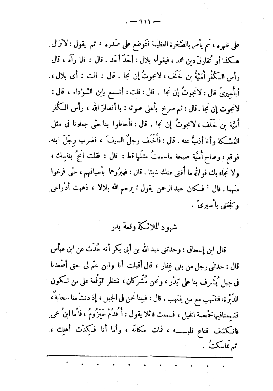 لَا نَجَوْت إنْ نَجَا. قَالَ: ثُمّ صَرَخَ بِأَعْلَى صَوْتِهِ: يَا أَنْصَارَ اللهِ، رَأْسُ الْكُفْرِ أُمَيّةُ بْنُ خَلَفٍ، لَا نَجَوْتُ إنْ نَجَا. قَالَ: فَأَحَاطُوا بِنَا حَتّى جَعَلُونَا فِي مِثْلِ الْمُسْكَةِ وَأَنَا أَذُبّ عَنْهُ. قَالَ: فَأَخْلَفَ رَجُلٌ السّيْفَ، فَضَرَبَ رِجْلَ ابْنِهِ فَوَقَعَ، وَصَاحَ أُمَيّةُ صَيْحَةً مَا سَمِعْتُ مِثْلَهَا قَطّ: قَالَ: فَقُلْت اُنْجُ بِنَفْسِك، وَلَا نُجَاءَ بِك فو الله مَا أُغْنِي عَنْك شَيْئًا. قَالَ: فَهَبِرُوهُمَا بِأَسْيَافِهِمْ، حَتّى فَرَغُوا مِنْهُمَا. قَالَ: فَكَانَ عَبْدُ الرّحْمَنِ يَقُولُ: يَرْحَمُ اللهُ بِلَالًا، ذَهَبَتْ أَدْرَاعِي وَفَجَعَنِي بأسيرىّ.