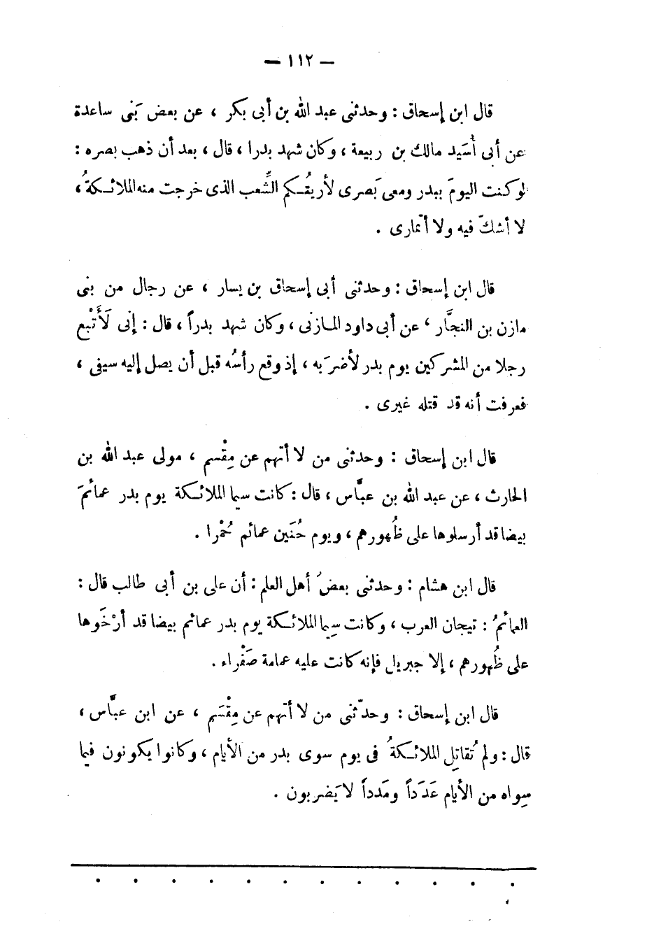 قَالَ ابْنُ إسْحَاقَ: وَحَدّثَنِي مَنْ لَا أَتّهِمُ عَنْ مِقْسَمٍ، عَنْ ابْنِ عَبّاسٍ، قَالَ: وَلَمْ تُقَاتِلْ الْمَلَائِكَةُ فِي يَوْمٍ سِوَى بَدْرٍ مِنْ الْأَيّامِ، وَكَانُوا يَكُونُونَ فِيمَا سِوَاهُ مِنْ الْأَيّامِ عَدَدًا وَمَدَدًا لَا يَضْرِبُونَ.