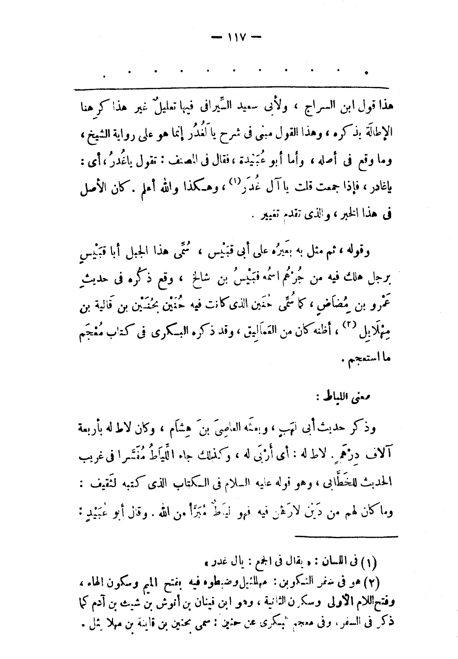 هَذَا قَوْلُ ابْنِ السّرَاجِ، وَلِأَبِي سَعِيدٍ السّيرَافِيّ فِيهَا تَعْلِيلٌ غَيْرُ هَذَا كَرِهْنَا الْإِطَالَةَ بِذِكْرِهِ، وَهَذَا الْقَوْلُ مَبْنِيّ فِي شَرْحِ يَا لَغُدُرِ إنّمَا هُوَ عَلَى رِوَايَةِ الشّيْخِ، وَمَا وَقَعَ فِي أَصْلِهِ، وَأَمّا أَبُو عُبَيْدَةَ، فَقَالَ فِي الْمُصَنّفِ: تَقُولُ يَا غُدُرُ، أَيْ: