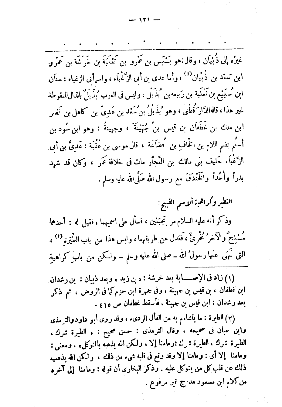 (2) الطيرة: ما يتشاءم به من الفأل الردىء، وقد روى أبو داود والترمذى وابن حبان فى صحيحه، وقال الترمذى: حسن صحيح: «الطيرة شرك، الطيرة شرك، الطيرة شرك، ومامنا إلا، ولكن الله يذهبه بالتوكل» . ومعنى: ومامنا إلا أى: ومامنا إلا وقد وقع فى قلبه شىء من ذلك، ولكن الله يذهب ذلك عن قلب كل من يتوكل عليه. وذكر البخارى أن قوله: ومامنا إلى آخره من كلام ابن مسعود مدج غير مرفوع.