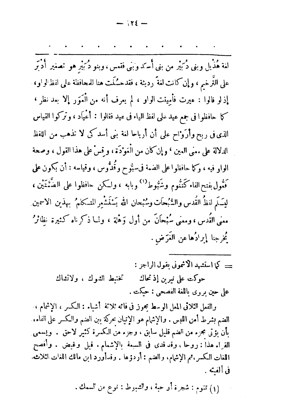 لُغَةُ هُذَيْلِ وَبَنِيّ دُبَيْرٍ مِنْ بَنِي أَسَدٍ وَبَنِيّ فَقُعِسَ، وَبَنُو دُبَيْرٍ هُوَ تَصْغِيرُ أَدْبَرَ عَلَى التّرْخِيمِ، وَإِنْ كَانَتْ لُغَةً رَدِيئَةً، فَقَدْ حَسُنَتْ هُنَا لِلْمُحَافَظَةِ عَلَى لَفْظِ الْوَاوِ، إذْ لَوْ قَالُوا: عِيرَتْ فَأُمِيتَتْ الْوَاو، لَمْ يُعْرَفْ أَنّهُ مِنْ الْعَوَرِ إلّا بَعْدَ نَظَرٍ، كَمَا حَافَظُوا فِي جَمْعِ عِيدٍ عَلَى لَفْظِ الْيَاءِ فِي عِيدٍ فَقَالُوا: أَعْيَادٌ، وَتَرَكُوا الْقِيَاسَ الّذِي فِي رِيحٍ وَأَرْوَاحٍ عَلَى أَنّ أَرْيَاحًا لُغَةُ بَنِي أَسَدٍ كَيْ لَا تَذْهَبَ مِنْ اللّفْظِ الدّلَالَةُ عَلَى مَعْنَى الْعَيْنِ، وَإِنْ كَانَ مِنْ الْعَوْدَةِ، وَقِسْ عَلَى هَذَا الْقَوْلِ، وَصِحّةِ الْوَاوِ فِيهِ، وَكَمَا حَافَظُوا عَلَى الضّمّةِ فِي سُبّوحٍ وَقُدّوسٍ، وَقِيَاسُهُ: أَنْ يَكُونَ عَلَى فَعّولٍ بِفَتْحِ الْفَاءِ كَتَنّومِ وَشَبّوطٍ «1» وَبَابِهِ، وَلَكِنْ حَافِظُوا عَلَى الضّمّتَيْنِ، لِيَسْلَمَ لَفْظُ الْقُدُسِ وَالسّبُحَاتِ وَسُبْحَانَ اللهِ يَسْتَشْعِرُ الْمُتَكَلّمُ بِهَذَيْنِ الِاسْمَيْنِ مَعْنَى الْقُدُسِ، وَمَعْنَى سُبْحَانَ مِنْ أَوّلِ وَهْلَةٍ، وَلَمّا ذَكَرْنَاهُ كَثِيرَةٌ نظائر يخرجنا إيرادها عن الغرض.