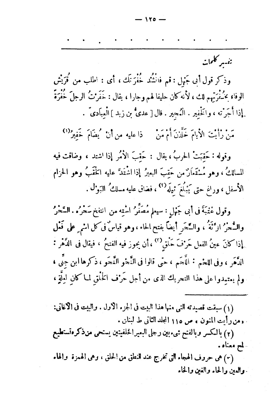تَفْسِيرُ كَلِمَاتٍ وَذَكَرَ قَوْلَ أَبِي جَهْلٍ: قُمْ فَانْشُدْ خُفْرَتَكَ، أَيْ: اُطْلُبْ مِنْ قُرَيْشٍ الْوَفَاءَ بِخُفْرَتِهِمْ لَك، لِأَنّهُ كَانَ حَلِيفًا لَهُمْ وَجَارًا، يُقَال: خَفَرْت الرّجُلَ خُفْرَةً إذَا أَجَرْته، وَالْخَفِيرُ. الْمُجِيرُ. قَالَ [عَدِيّ بْنُ زَيْدٍ] الْعِبَادِيّ.