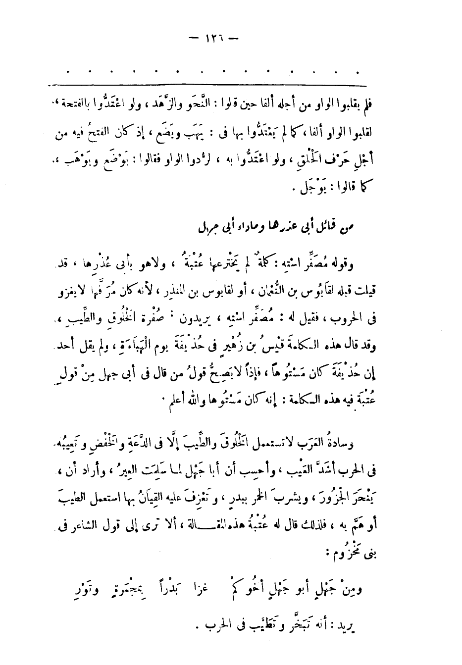 مَنْ قَائِلٌ أَبِي عذرها وماداء أَبِي جَهْلٍ وَقَوْلُهُ مُصَفّرُ اسْتِهِ: كَلِمَةٌ لَمْ يَخْتَرِعْهَا عُتْبَةُ، وَلَا هُوَ بِأَبِي عُذْرِهَا، قَدْ قِيلَتْ قَبْلَهُ لِقَابُوسِ بْنِ النّعْمَانِ، أَوْ لِقَابُوسِ بْنِ الْمُنْذِرِ، لِأَنّهُ كَانَ مُرَفّهًا لَا يَغْزُو فِي الْحُرُوبِ، فَقِيلَ لَهُ: مُصَفّرُ اسْتِهِ، يُرِيدُونَ: صُفْرَةَ الْخُلُوقِ وَالطّيبِ، وَقَدْ قَالَ هَذِهِ الْكَلِمَةَ قَيْسُ بْنُ زُهَيْرٍ فِي حُذَيْفَةَ يَوْمَ الْهَبَاءَةِ، وَلَمْ يَقُلْ أَحَدٌ إنّ حُذَيْفَةَ كَانَ مَسْتُوهًا، فَإِذَا لَا يَصِحّ قَوْلُ مَنْ قَالَ فِي أَبِي جَهْلٍ مِنْ قَوْلِ عُتْبَةَ فِيهِ هَذِهِ الْكَلِمَةَ: إنّهُ كَانَ مَسْتُوهًا وَاَللهُ أَعْلَمُ.