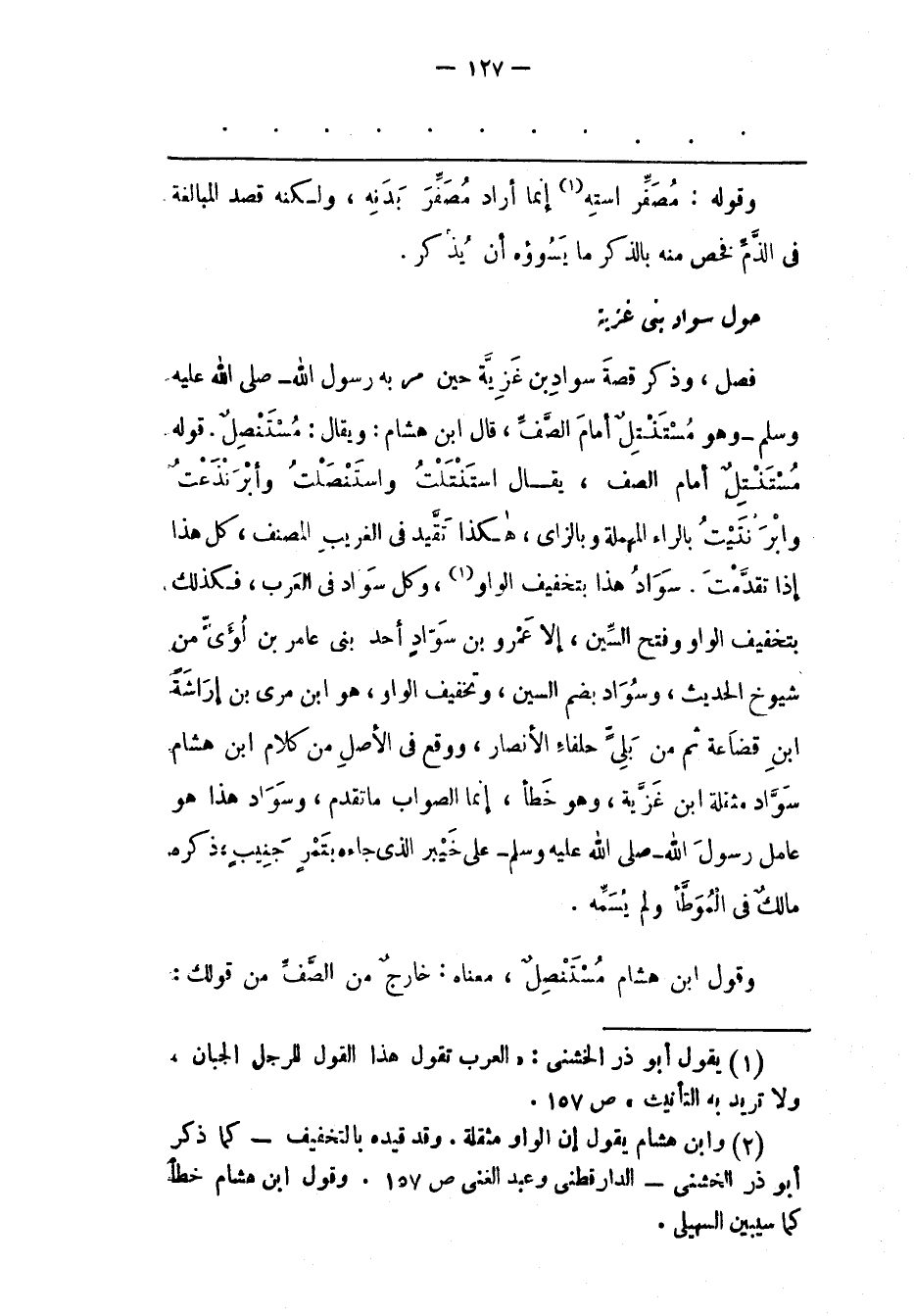 حَوْلَ سَوَادِ بَنِي غَزِيّةَ فَصْلٌ، وَذَكَرَ قِصّةَ سَوَادِ بْنِ غَزِيّةَ حِينَ مَرّ به رسول الله- صلى الله عليه وسلم- وَهُوَ مُسْتَنْتِلٌ أَمَامَ الصّفّ، قَالَ ابْنُ هِشَامٍ: وَيُقَالُ: مُسْتَنْصِلٌ. قَوْلُهُ مُسْتَنْتِلٌ أَمَامَ الصّفّ، يُقَالُ استنتلت واستنصلت وأبر نذعت وابر نتيت بِالرّاءِ الْمُهْمَلَةِ وَبِالزّايِ، هَكَذَا تَقَيّدَ فِي الْغَرِيبِ الْمُصَنّفِ، كُلّ هَذَا إذَا تَقَدّمْت. سَوَادٌ هَذَا بِتَخْفِيفِ الْوَاوِ «2» ، وَكُلّ سَوَادٍ فِي الْعَرَبِ، فَكَذَلِكَ بِتَخْفِيفِ الْوَاوِ وَفَتْحِ السّينِ، إلّا عَمْرَو بْنَ سَوَادٍ أَحَدَ بَنِي عَامِرِ بْنِ لُؤَيّ مِنْ شُيُوخِ الْحَدِيثِ، وَسُوَادٌ بِضَمّ السّينِ، وَتَخْفِيفِ الْوَاوِ، هو ابن مرى بن إراشة ابن قُضَاعَةَ ثُمّ مِنْ بَلِيّ حُلَفَاءِ الْأَنْصَارِ، وَوَقَعَ فِي الْأَصْلِ مِنْ كَلَامِ ابْنِ هِشَامٍ سَوّادٌ مثقلة ابن غزّية، وهو خطأ، إنّمَا الصّوَابُ مَا تَقَدّمَ، وَسَوَادٌ هَذَا هُوَ عَامِلُ رَسُولِ اللهِ- صَلَّى اللَّهُ عَلَيْهِ وَسَلَّمَ- عَلَى خَيْبَرَ الّذِي جَاءَهُ بِتَمْرِ جَنِيبٍ، ذَكَرَهُ مَالِكٌ فِي الْمُوَطّأِ وَلَمْ يُسَمّهِ.