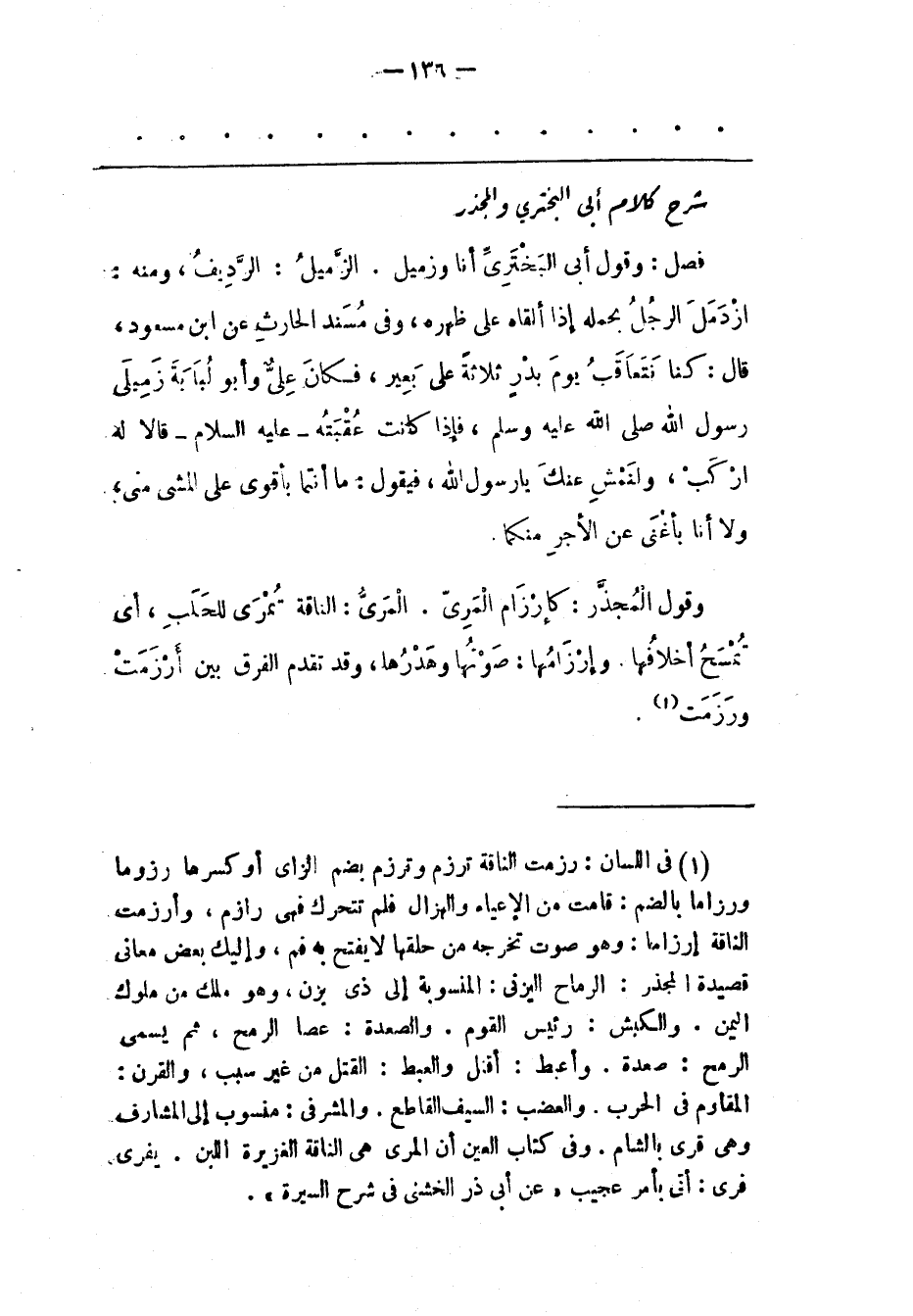 شَرْحُ كَلَامِ أَبِي الْبَخْتَرِيّ وَالْمُجَذّرُ فَصْلٌ: وَقَوْلُ أَبِي الْبَخْتَرِيّ أَنَا وَزَمِيلٌ. الزّمِيلُ: الرّدِيفُ، وَمِنْهُ: