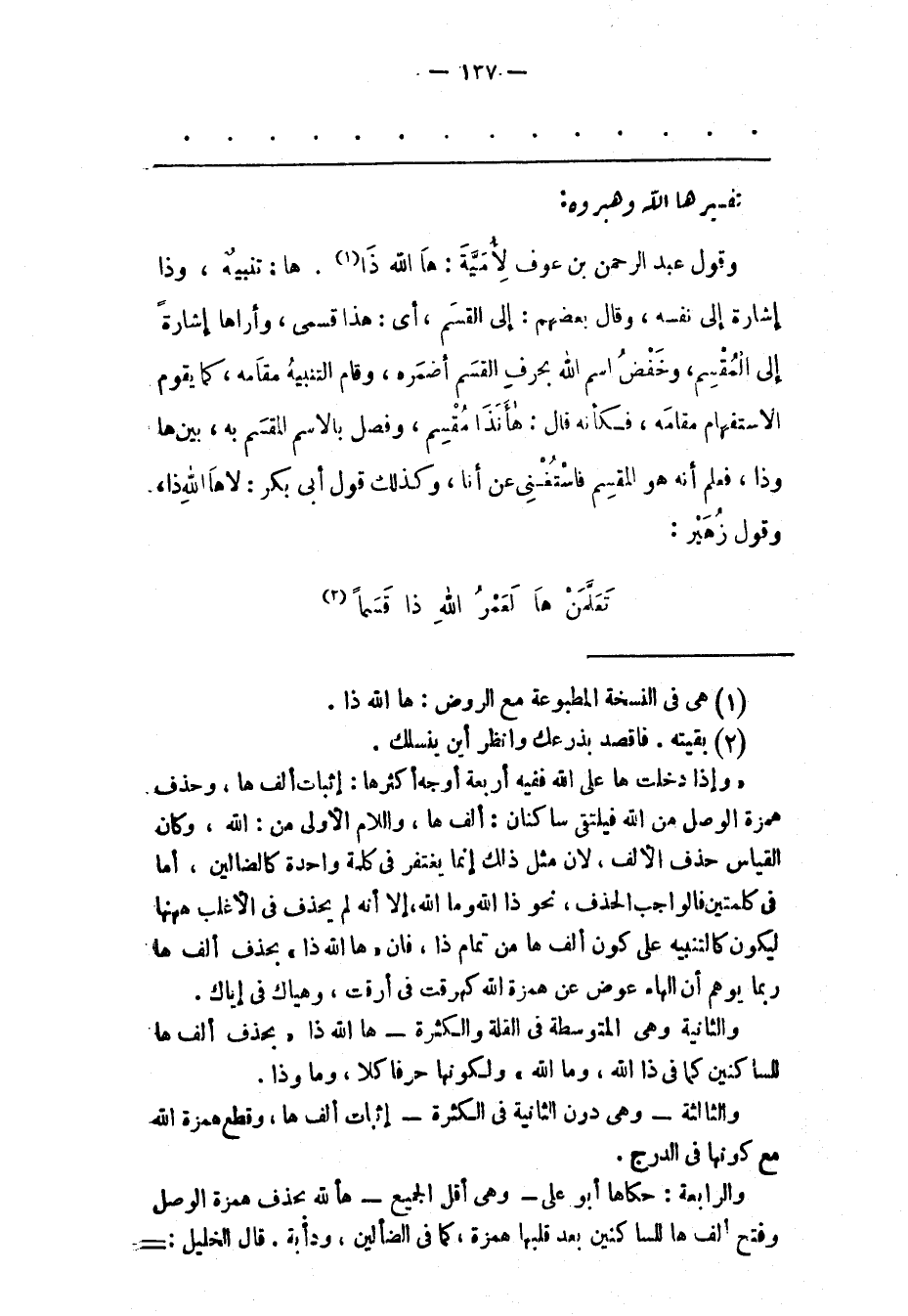 وَقَوْلُ عَبْدِ الرّحْمَنِ بْنِ عَوْفٍ لِأُمَيّةِ: هَا اللهِ ذَا «1» . هَا: تَنْبِيهٌ، وَذَا إشَارَةٌ إلَى نَفْسِهِ، وَقَالَ بَعْضُهُمْ: إلَى الْقَسَمِ، أَيْ: هَذَا قَسْمِي، وَأُرَاهَا إشَارَةً إلَى الْمُقْسِمِ، وَخَفْضُ اسْمِ اللهِ بِحَرْفِ الْقَسَمُ أَضْمَرَهُ، وَقَامَ التّنْبِيهُ مَقَامَهُ، كَمَا يَقُومُ الِاسْتِفْهَامُ مَقَامَهُ، فَكَأَنّهُ قال: هأنذا مُقْسِمٌ، وَفَصْلٌ بِالِاسْمِ الْمُقْسَمِ بِهِ، بَيْنَ هَا وَذَا، فَعُلِمَ أَنّهُ هُوَ الْمُقْسِمُ فَاسْتُغْنِيَ عَنْ أنا، وكذلك قول أبى بكر: لا ها الله ذا، وقول زهير: